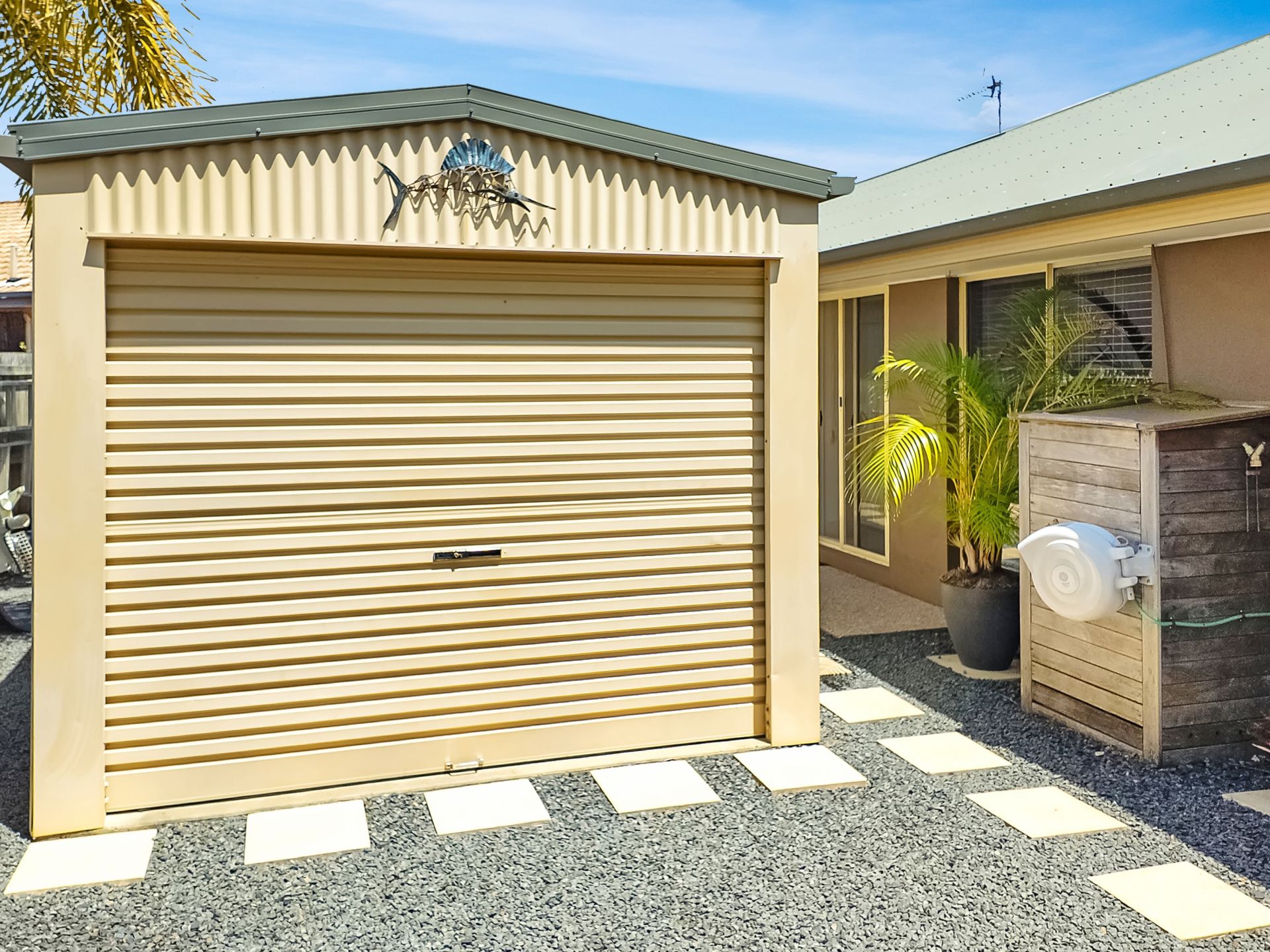 • Clear side access to the approx. 8m x 3m shed with power connected and a partitioned and lined workshop to the rear