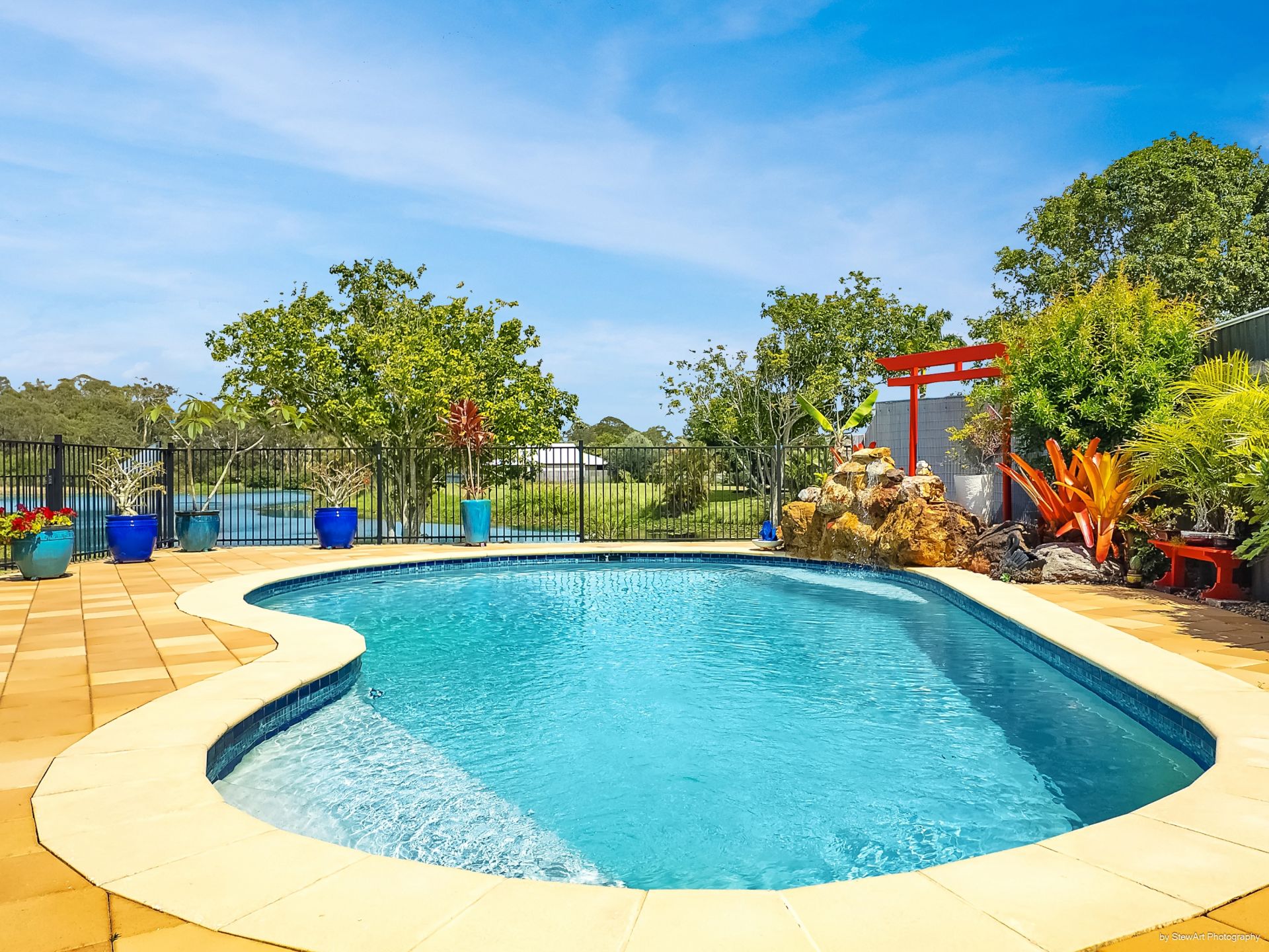 • A sparkling inground swimming pool that has been completely resurfaced with pebble Crete and glass stones, and features a splashing rock water feature