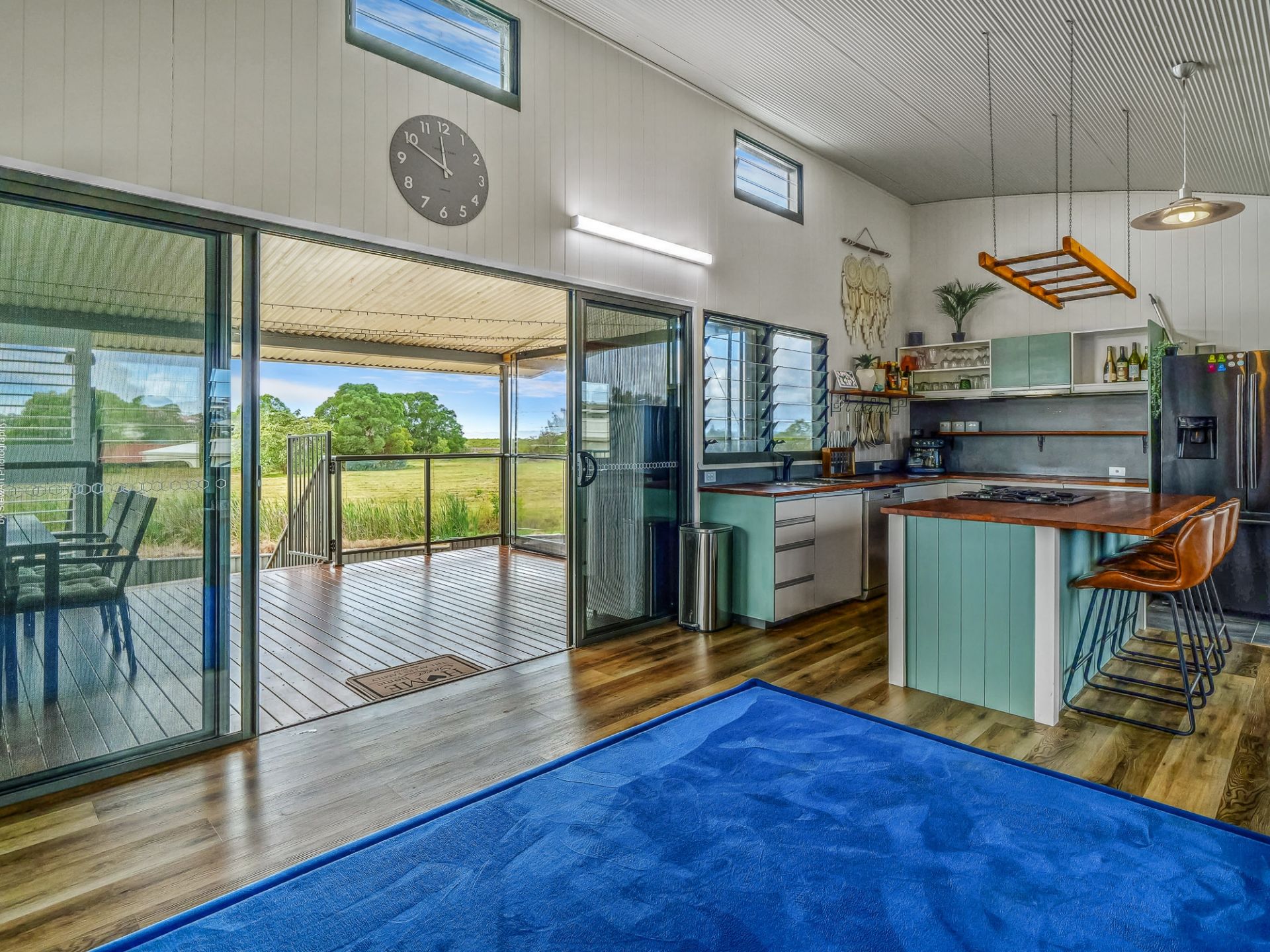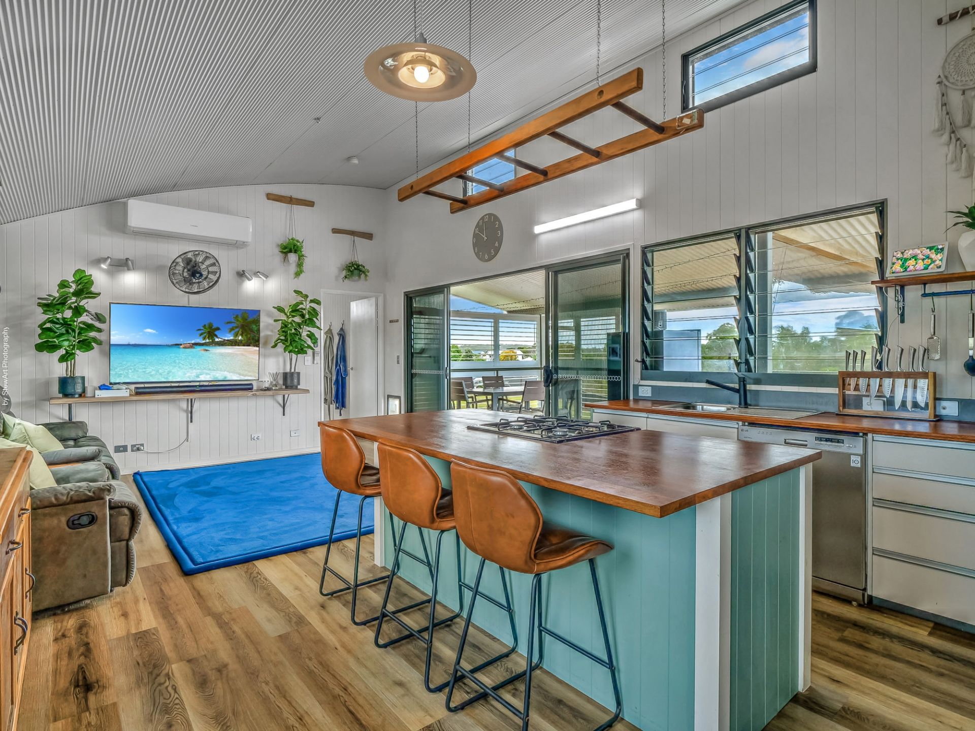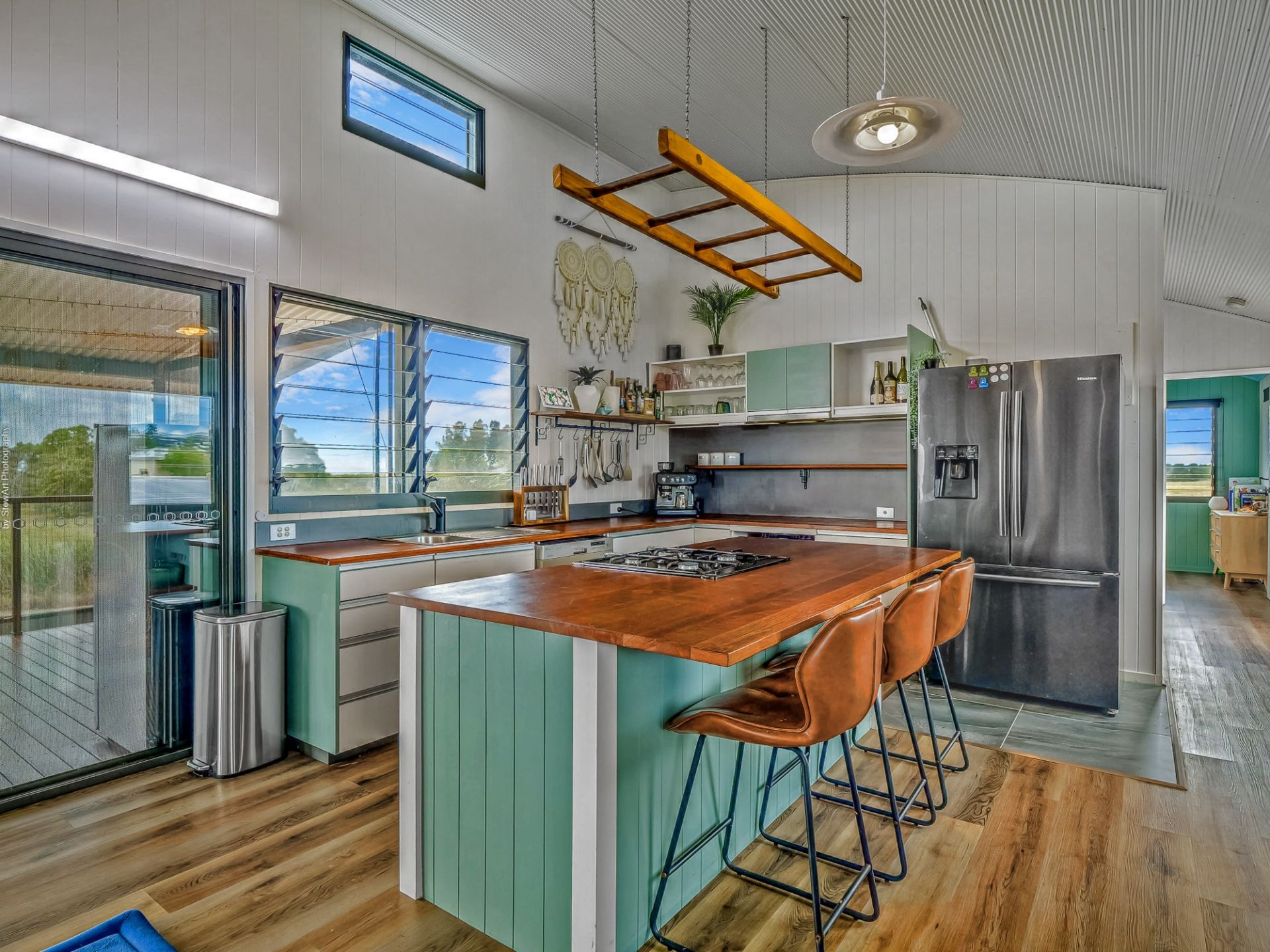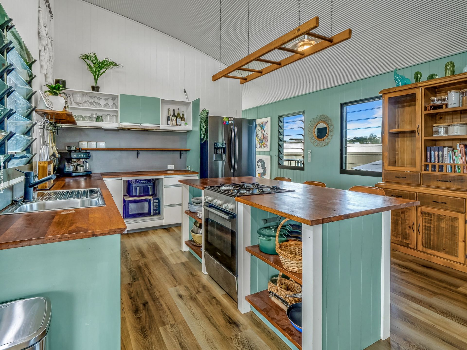 • The kitchen features a large island preparation bench, timber benchtops, a breakfast bar, and ample storage space