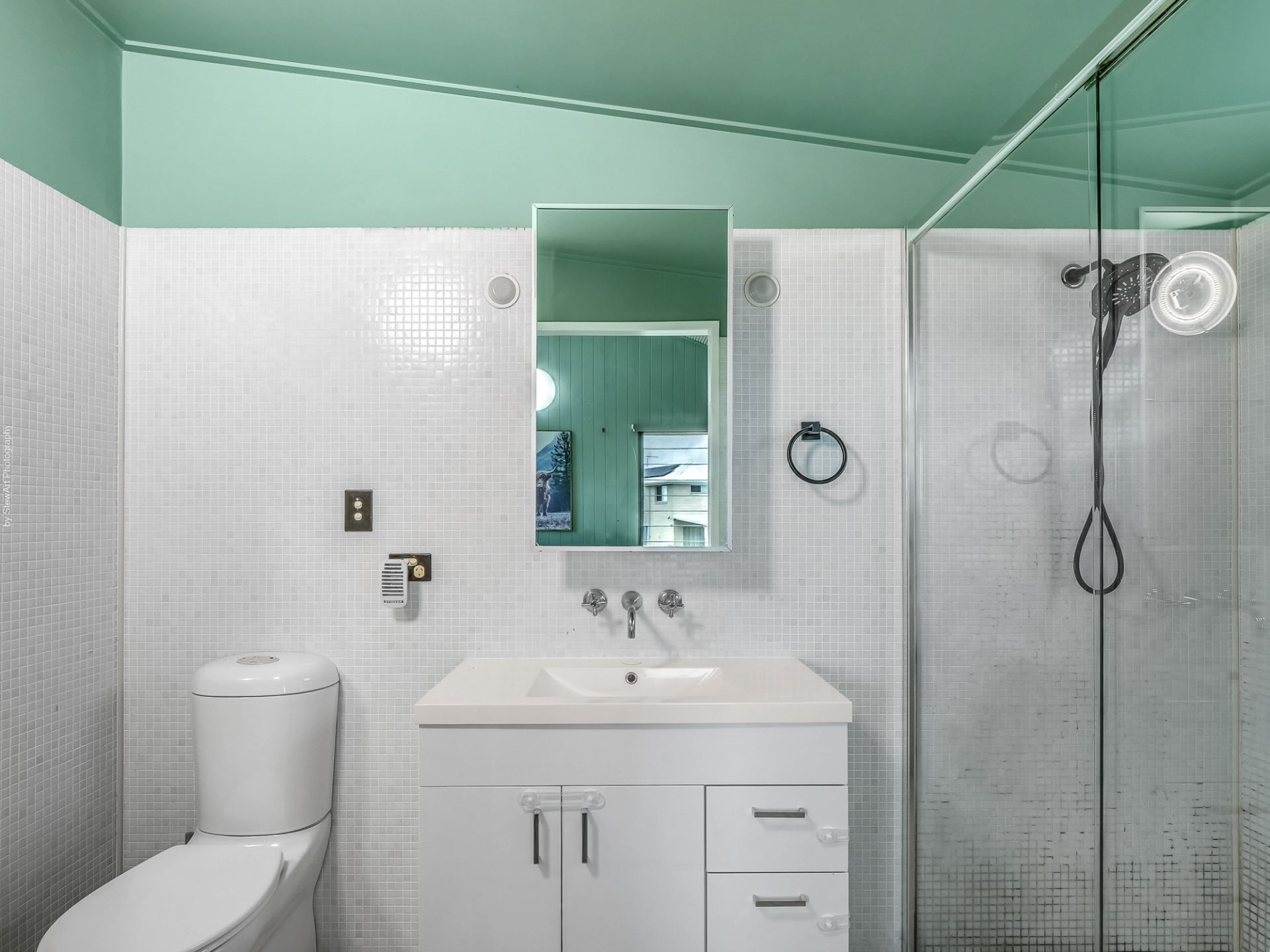• The bathroom features a mini-orb ceiling and includes a shower, vanity, and toilet
