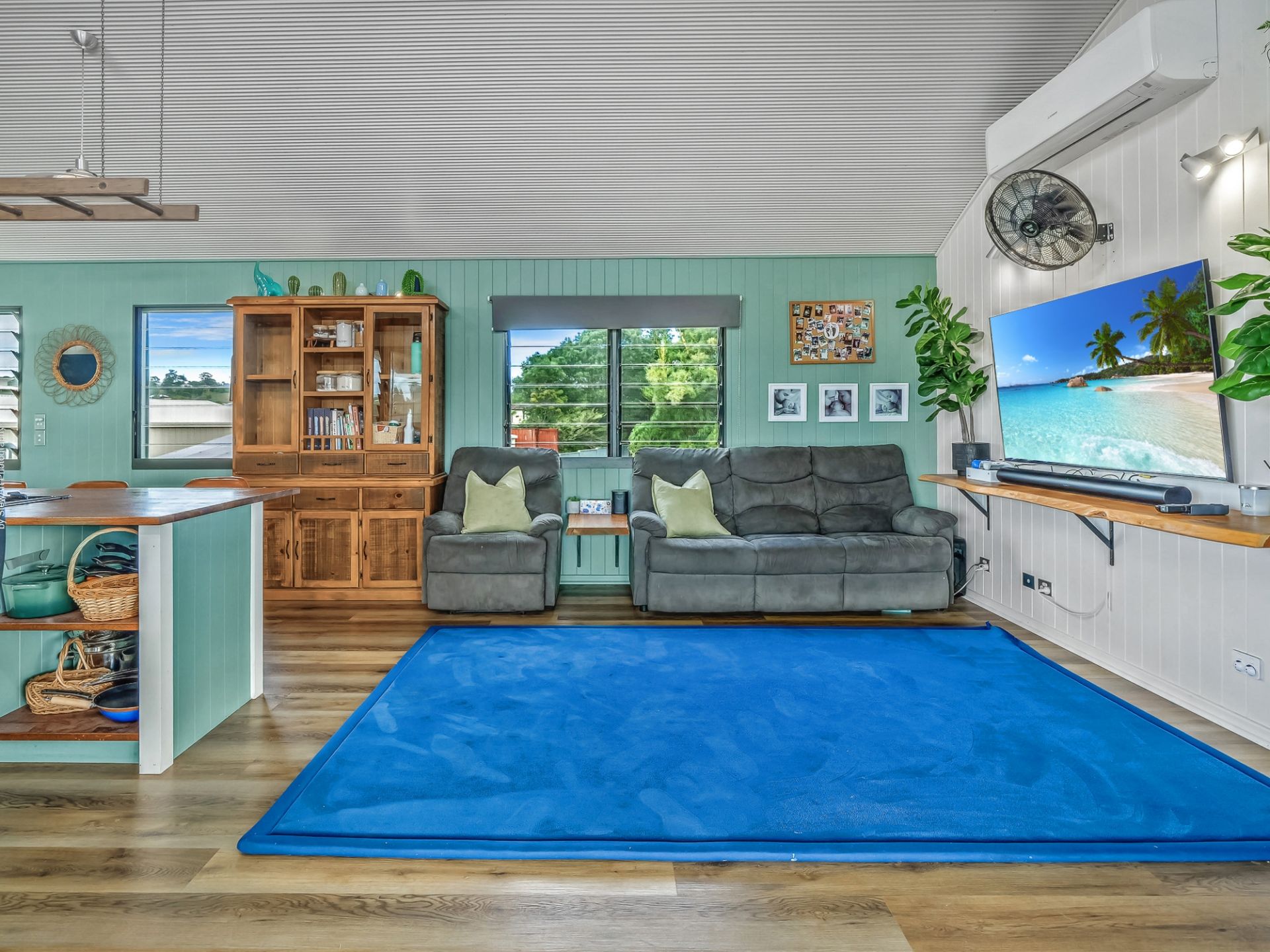 • A vast open-plan living and dining room featuring a high rounded ceiling with a mini-orb finish and reverse cycle split system air-conditioning