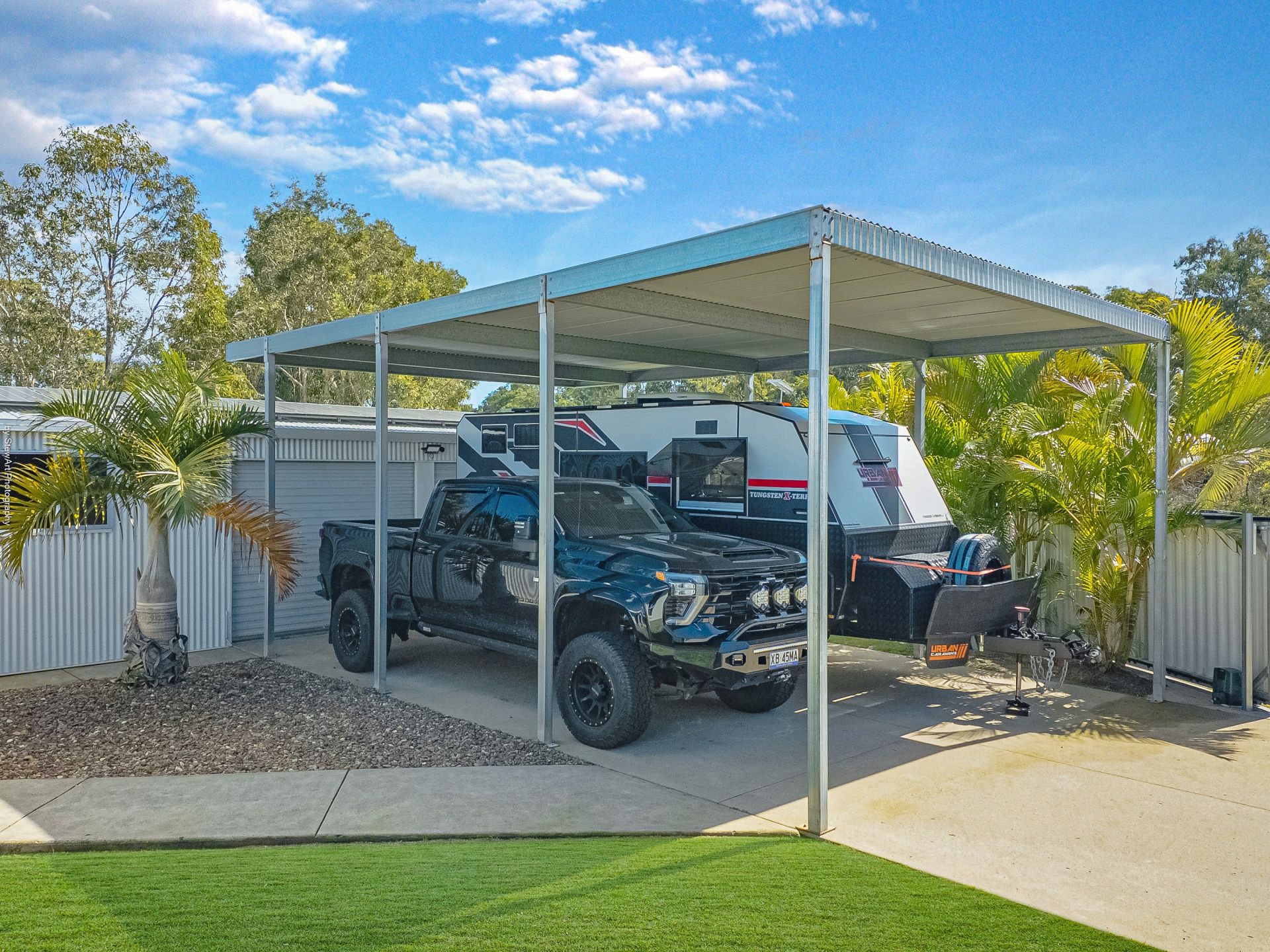 • Clear side access via remote entry gates to the approx. 10 x 7 metres high-entry caravan and boat port