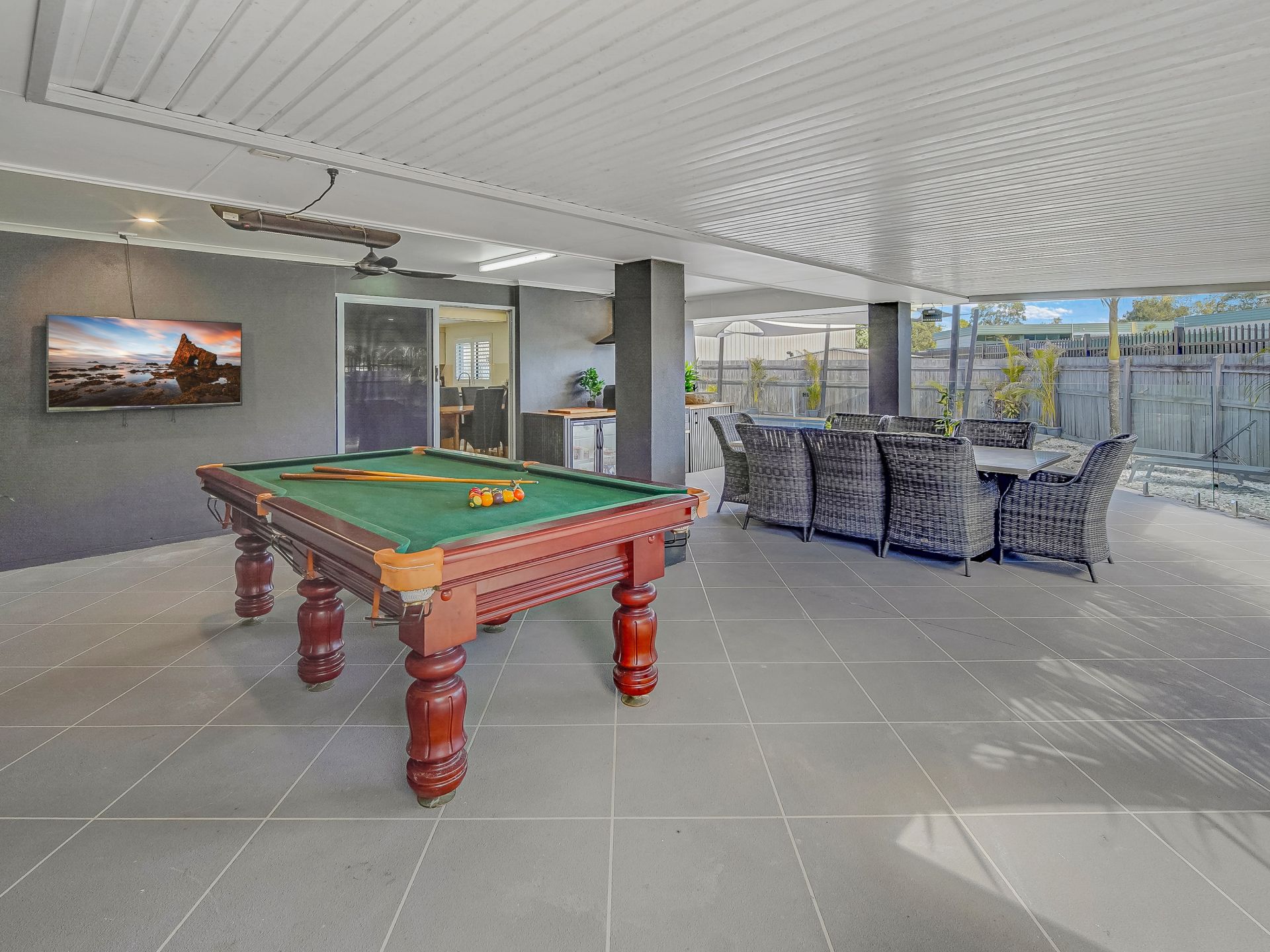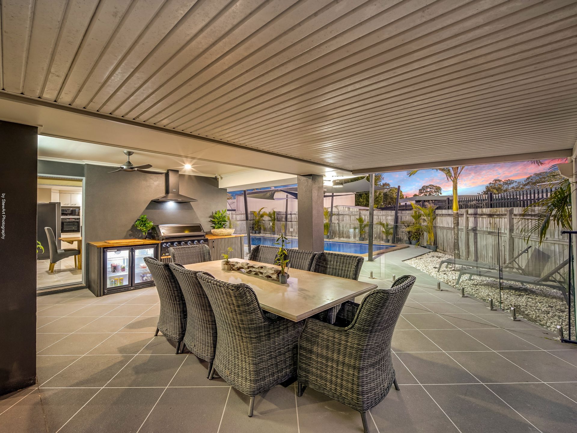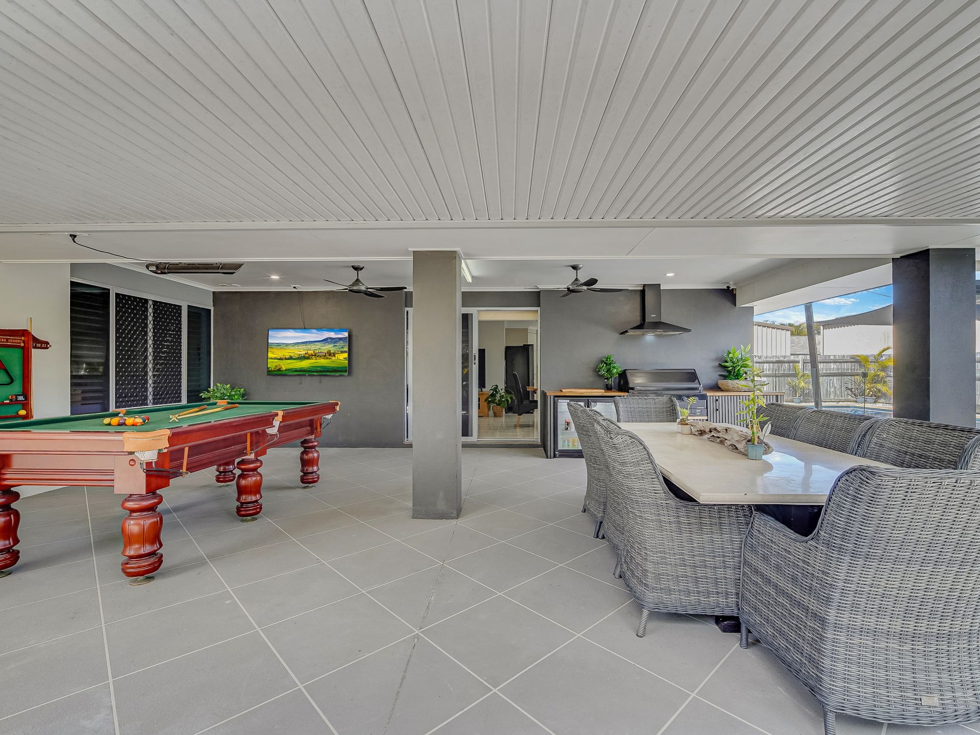 • An expansive alfresco outdoor entertaining area with ceiling fans, a heat bar, and a built-in outdoor kitchen with a sink and BBQ
