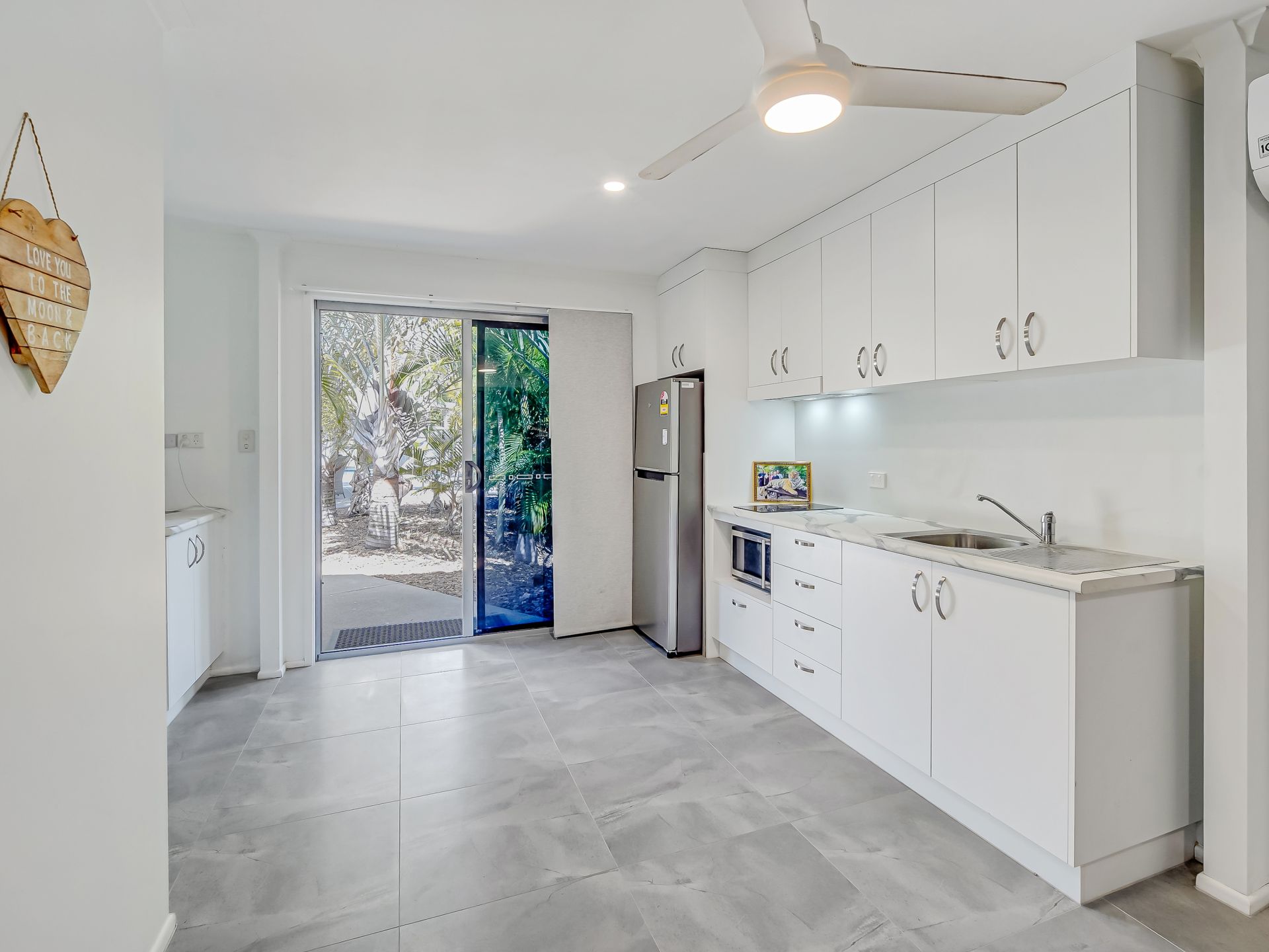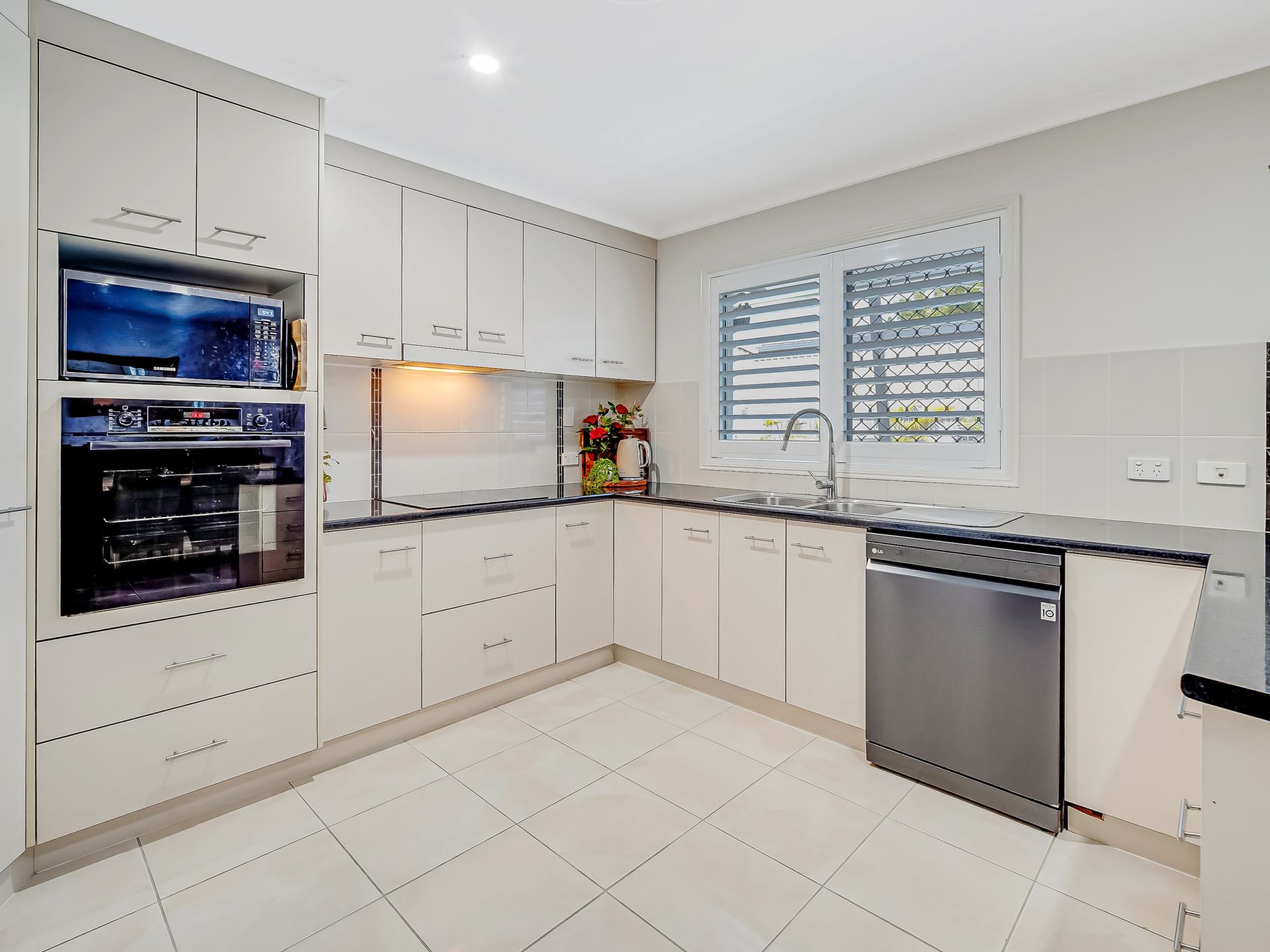 • Quality appliances include an induction hot plate with a rangehood, a wall oven, and a dishwasher