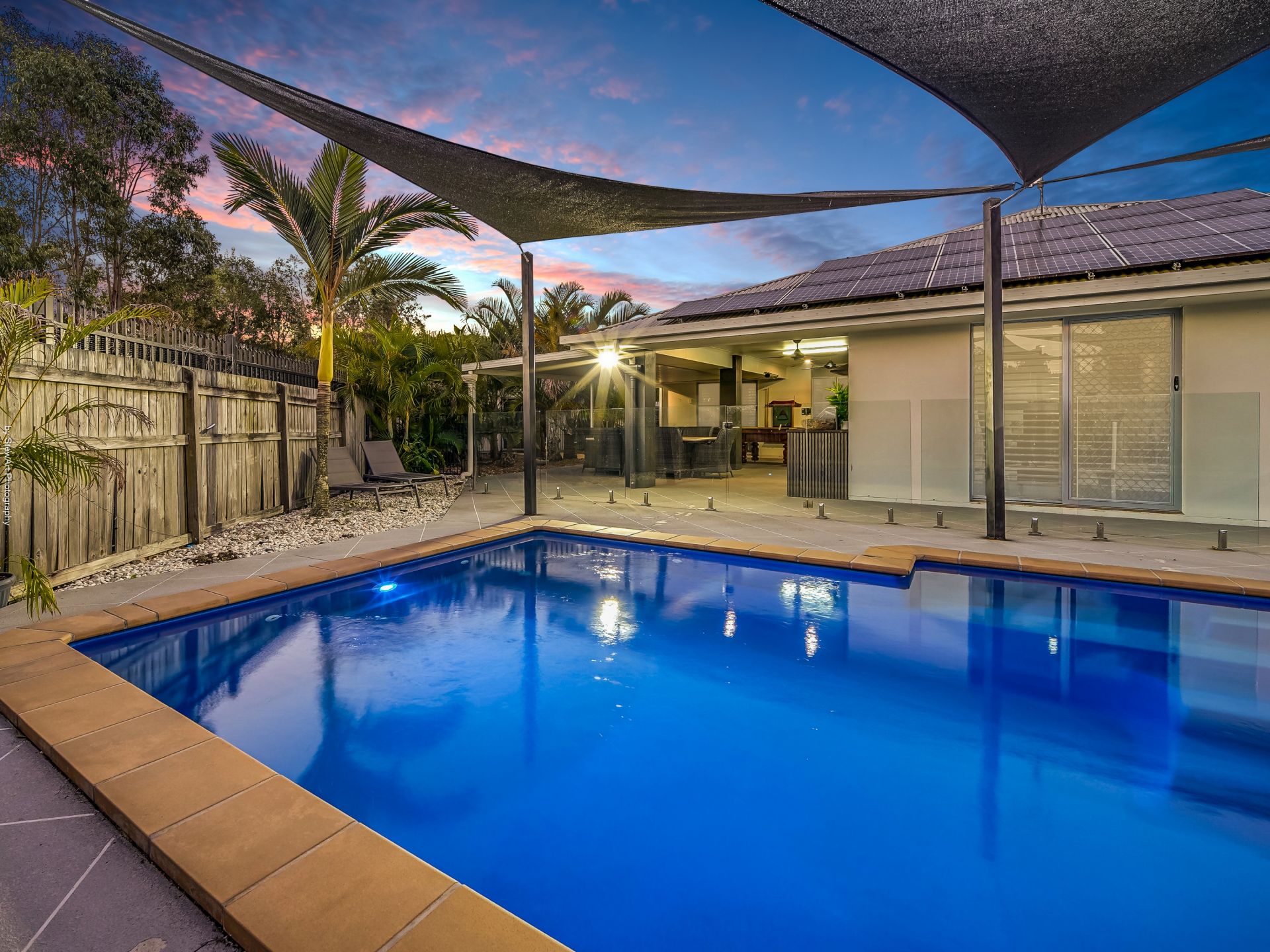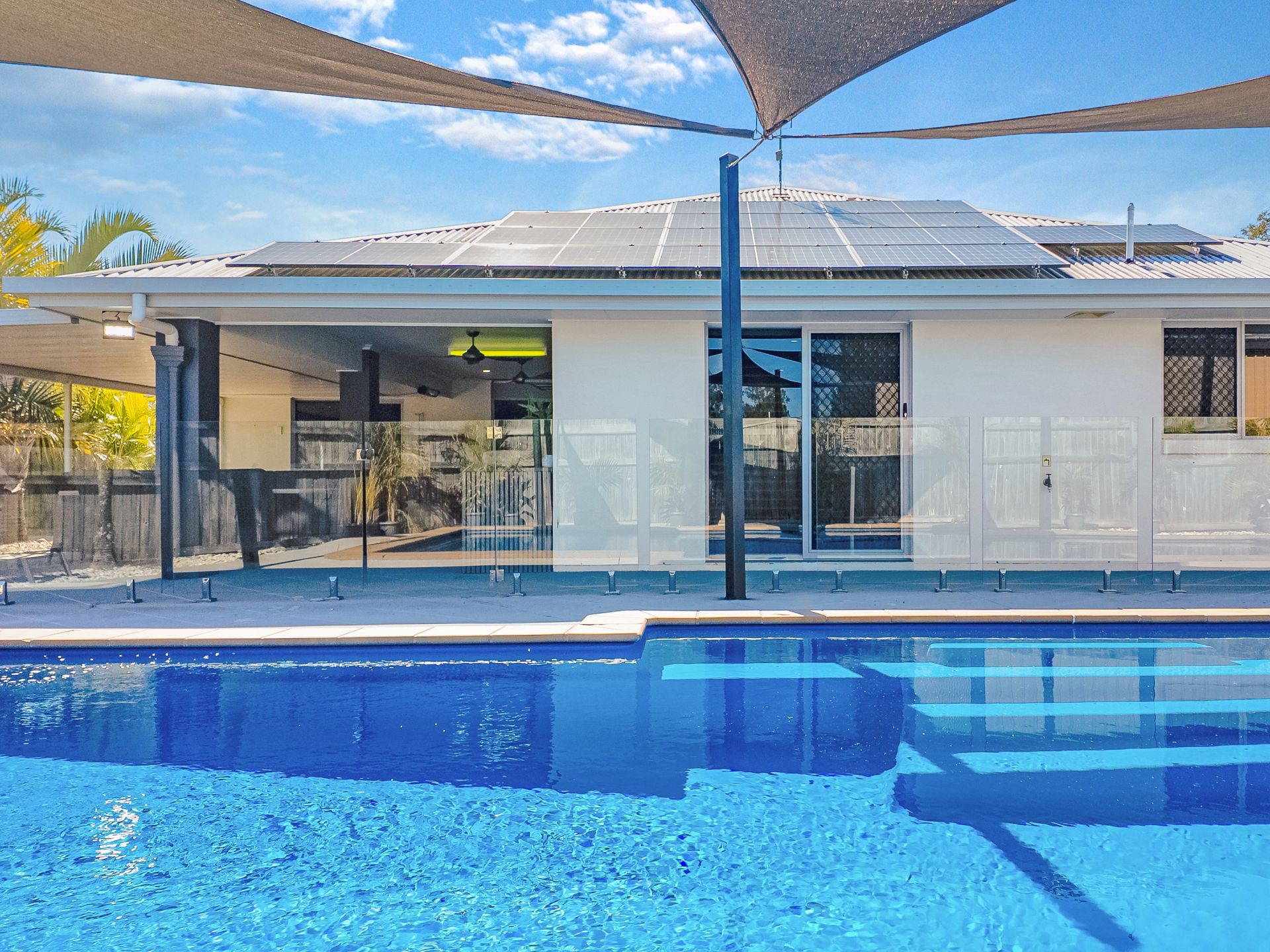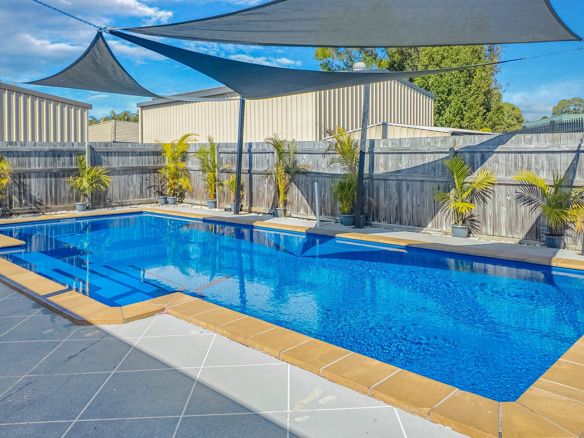 • A family-sized sparkling inground swimming pool with shade sails