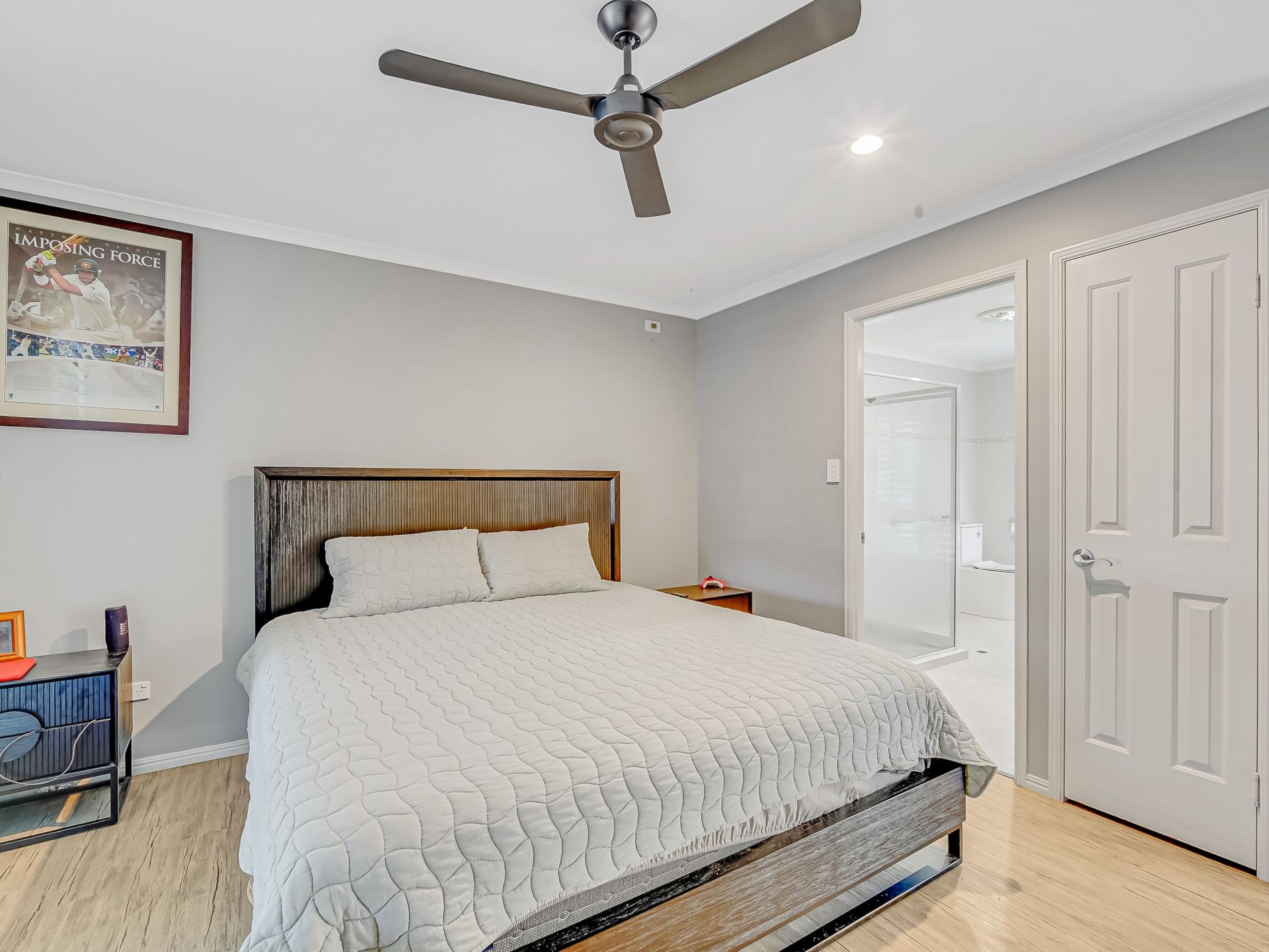• The main bedroom features a ceiling fan, reverse-cycle ducted air conditioning, a walk-in wardrobe, and a lavish ensuite with floor-to-ceiling tiles, a double basin vanity, a shower, and a toilet