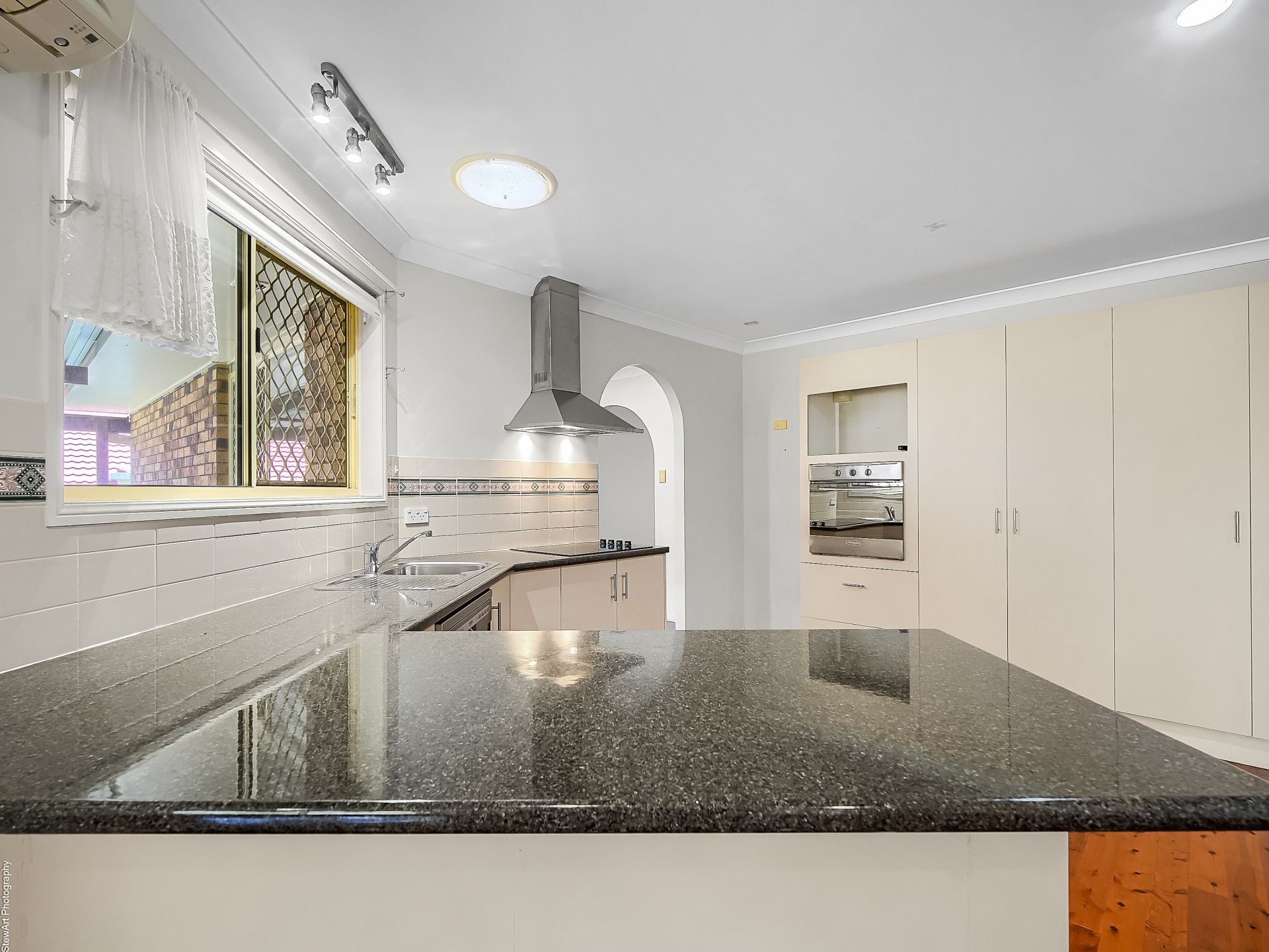• Appliances include an electric hot plate with a rangehood, a wall oven, and a dishwasher