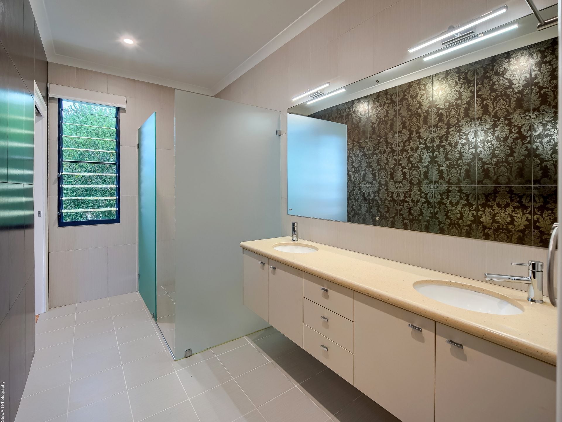 • A huge main bedroom with a ceiling fan, and a large walk-through wardrobe, plus a lavish ensuite with floor-to-ceiling tiles, a stone top vanity with two basins, a shower, and a toilet, plus direct access to the outdoor entertainment deck