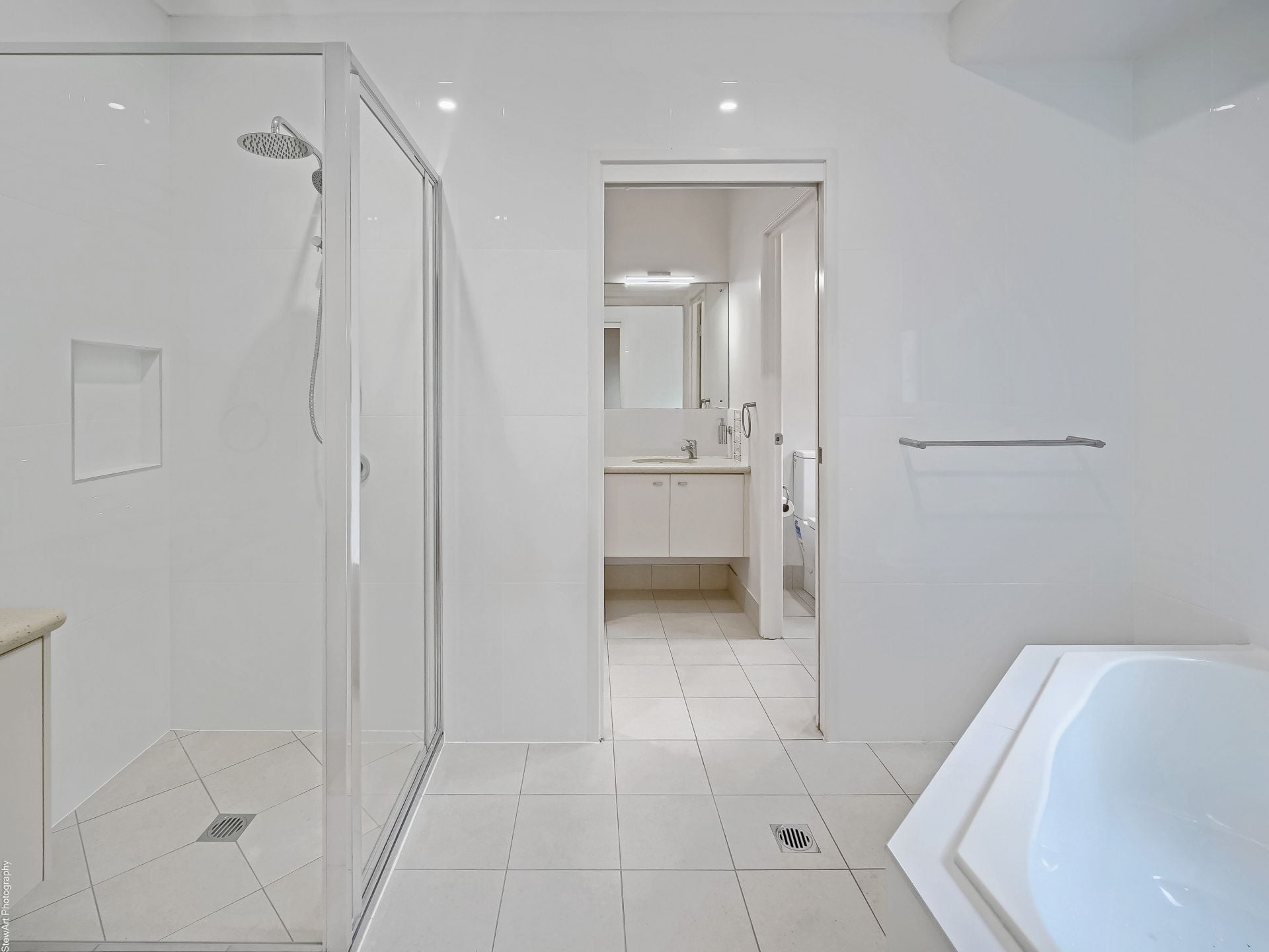 • The main bathroom has two-way access from the second bedroom and includes a bath, shower, and vanity, plus a separate powder room and toilet
