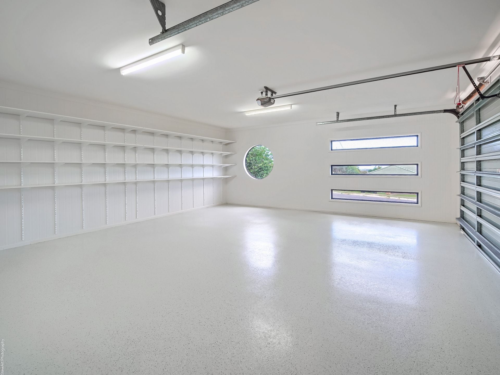 • An oversized double garage with high entry, seamless 2-pac epoxy flooring, built-in shelving and offers direct internal access to the home