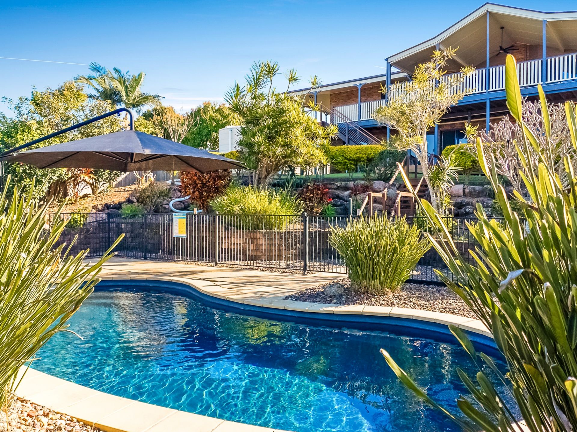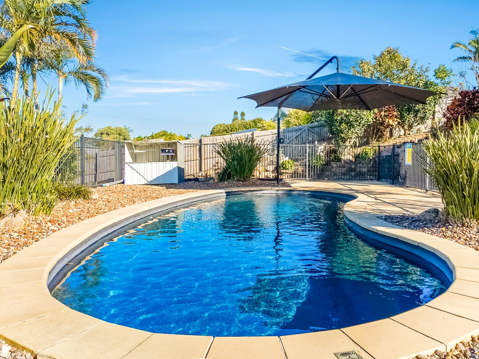 • A sparkling saltwater chlorinated in-ground swimming pool with a large shade umbrella