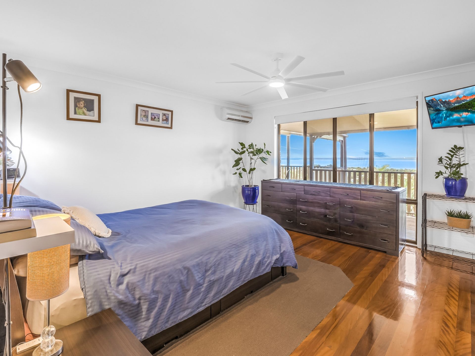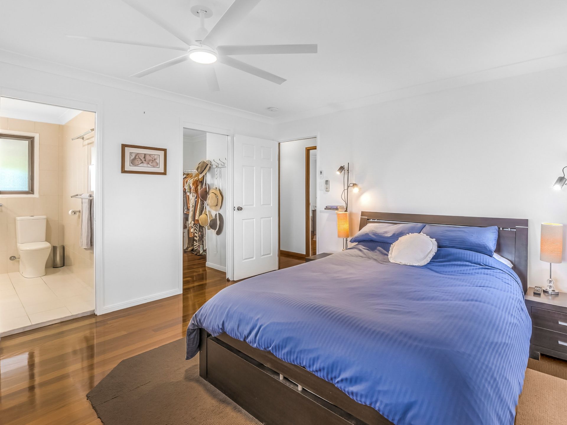 • The main bedroom includes a ceiling fan and a remote-controlled blind, split system air conditioning, a large walk-in wardrobe, and a lavish ensuite