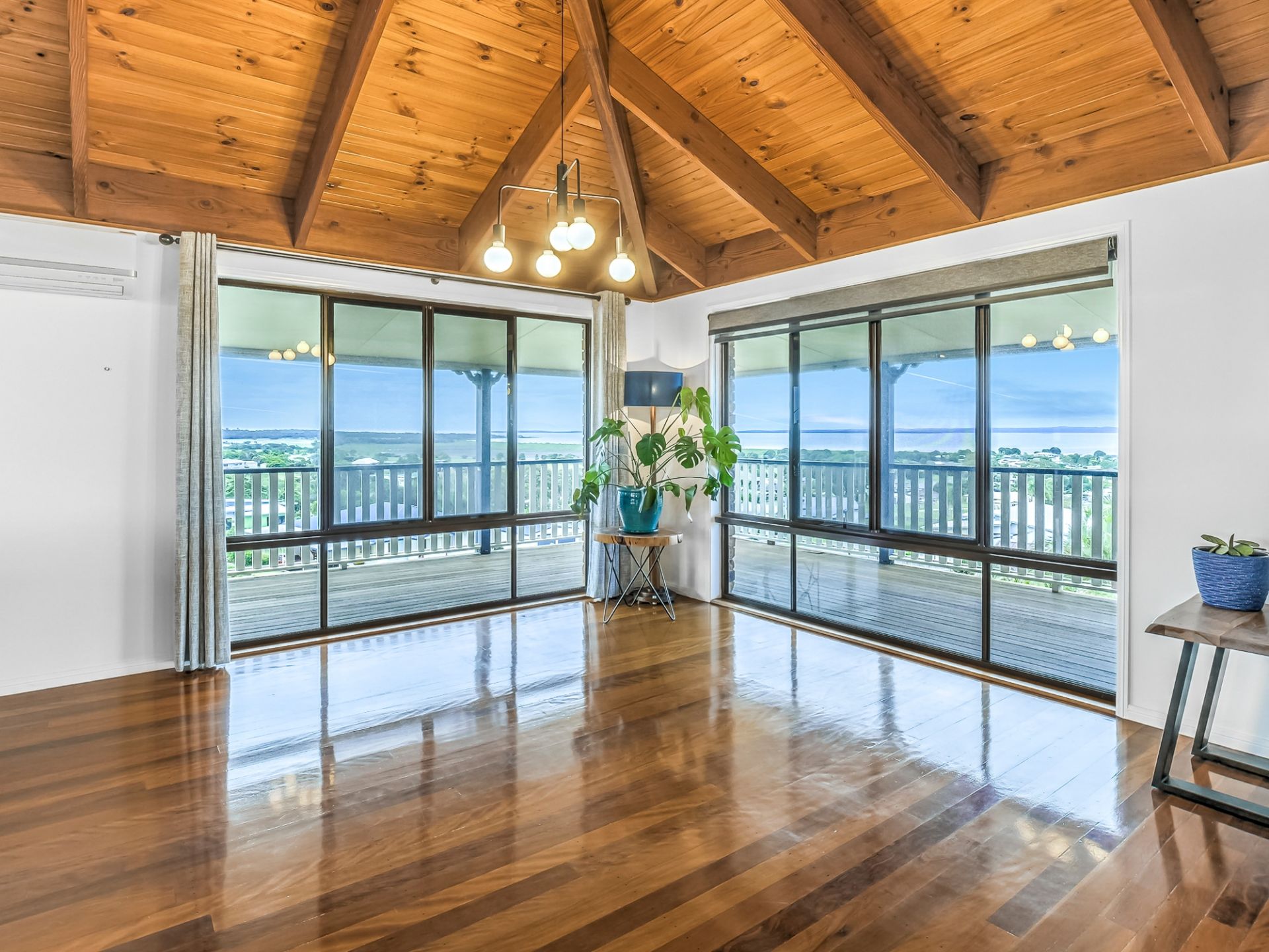 • A vast open-plan living and dining area with split system air-conditioning, high vaulted timber ceiling and exposed rafters, complimented by the beautiful polished hardwood floors