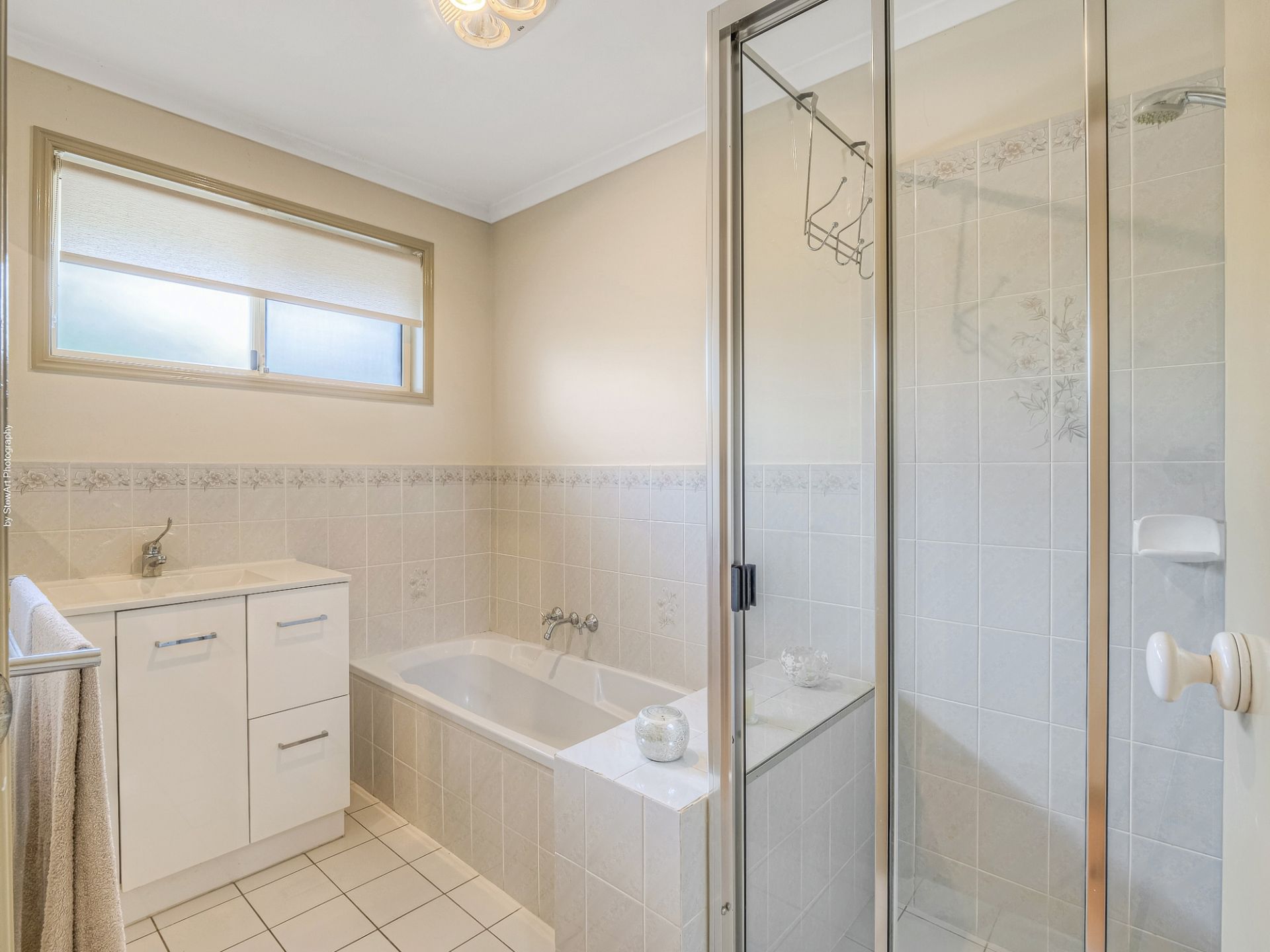 • The bathroom includes a vanity, bath, and shower, and there is a separate toilet