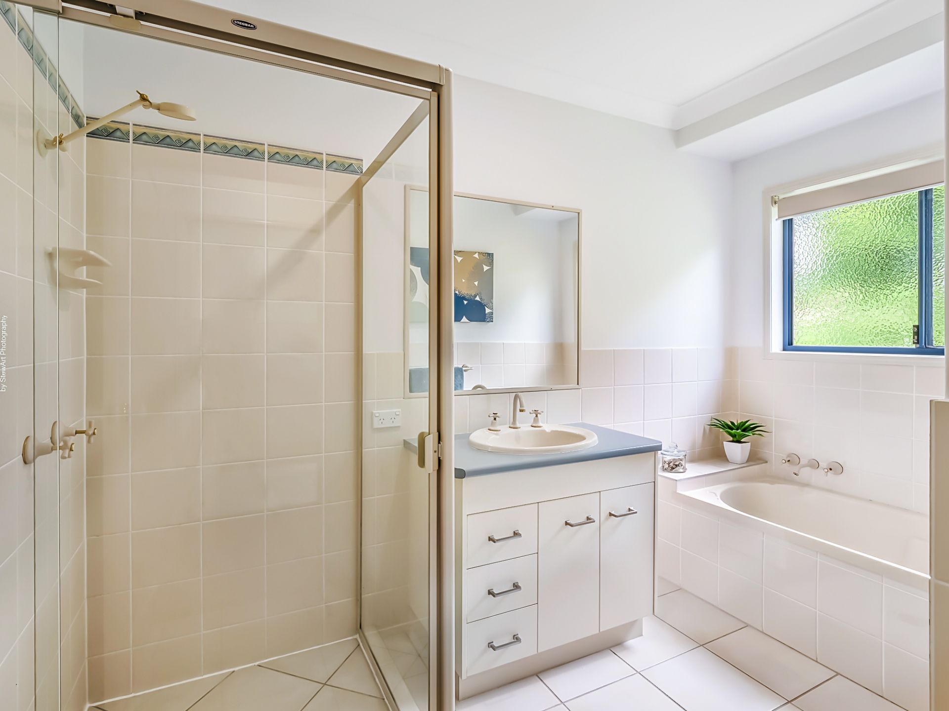 • The bathroom includes a vanity, shower and bath, and there is a separate toilet