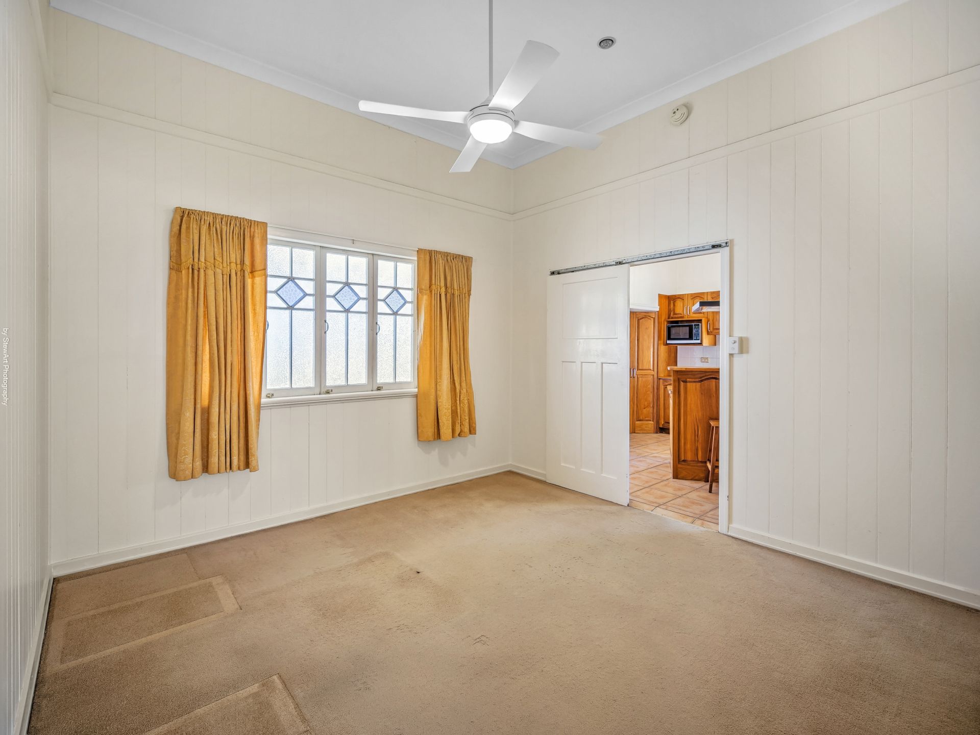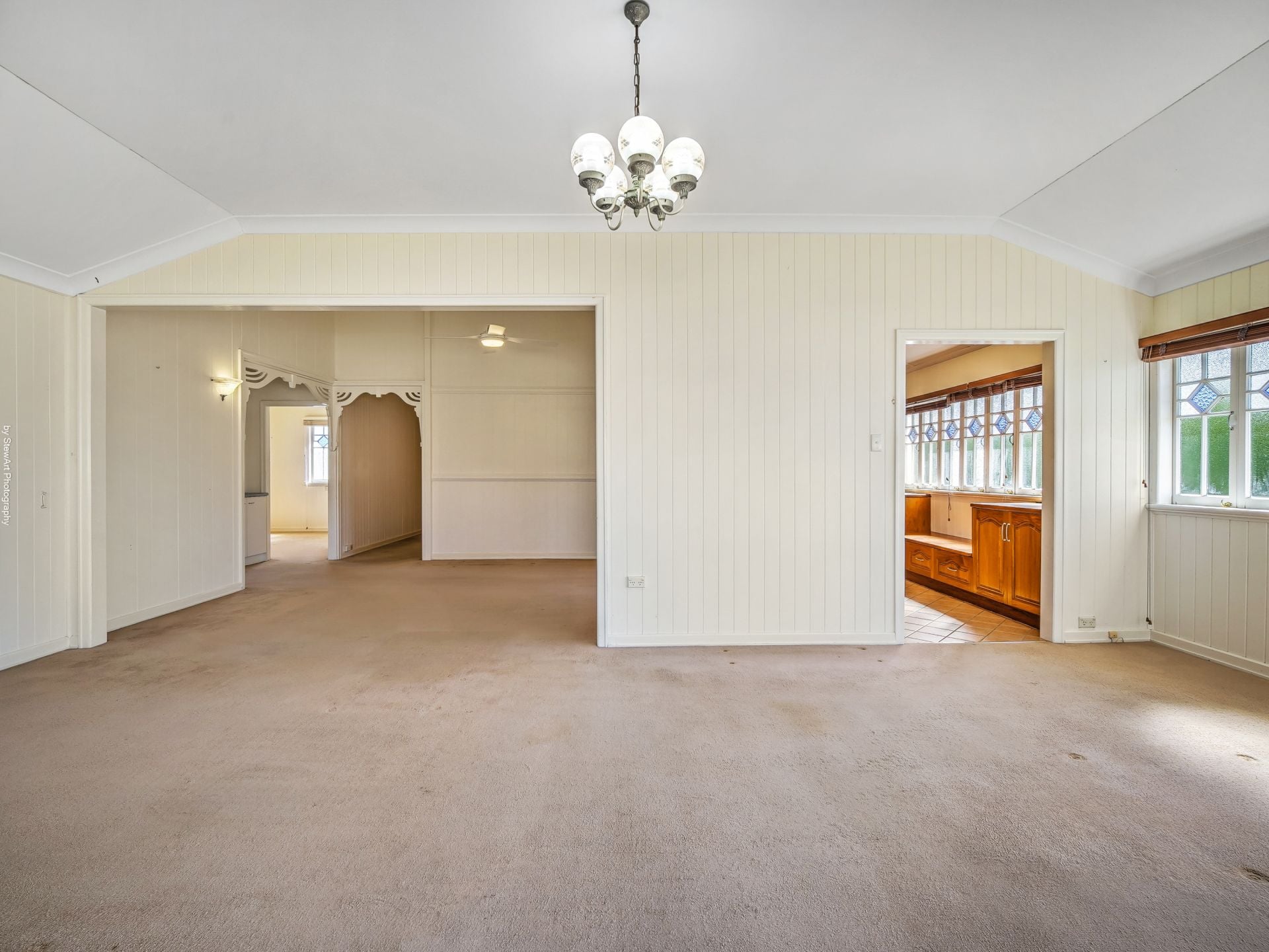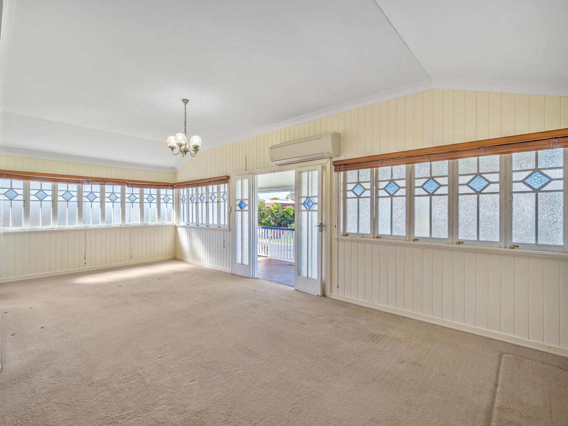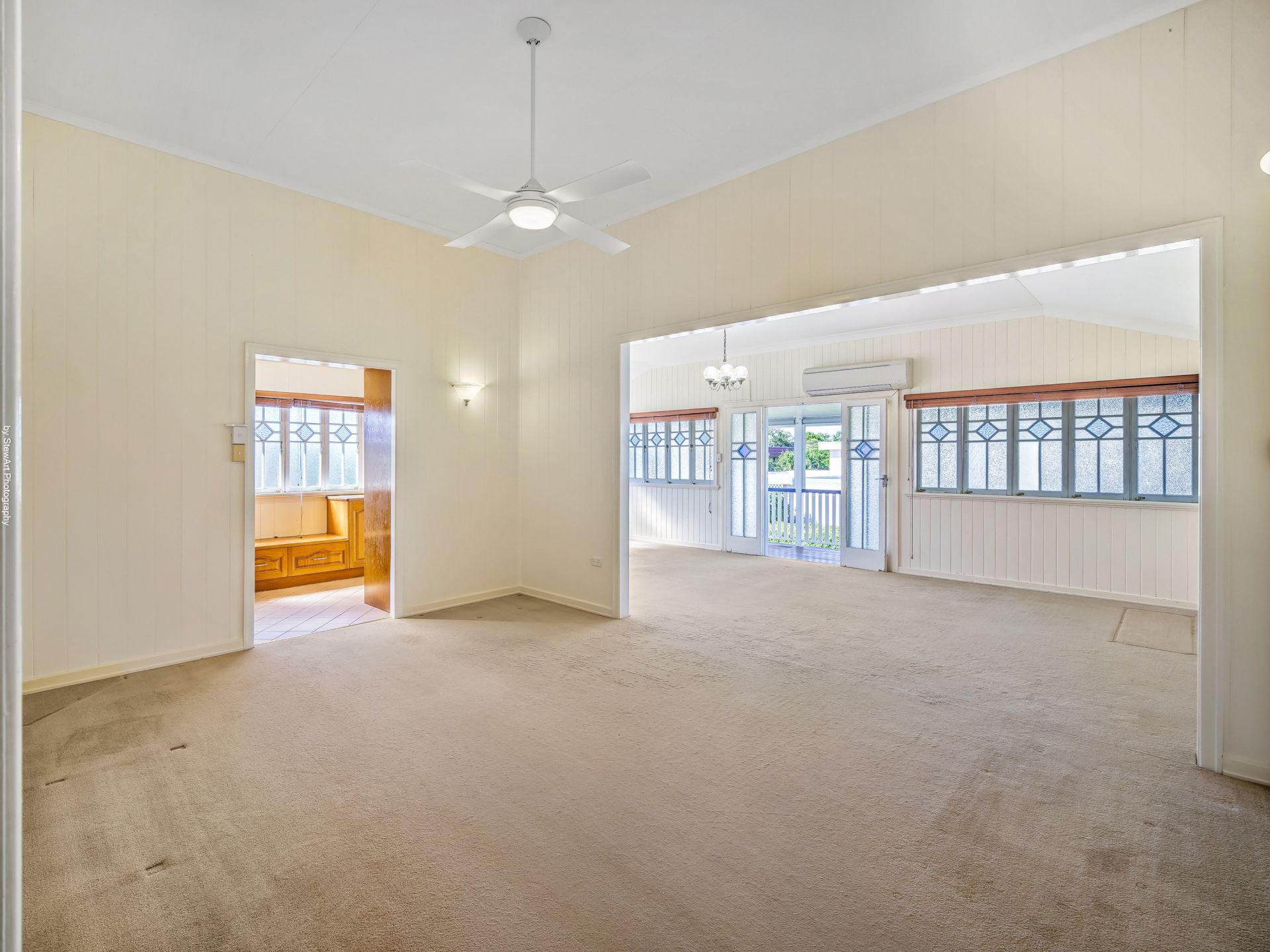 • A vast open-plan dining and living area with beautiful decorative casement windows, ceiling fan and split system air-conditioning