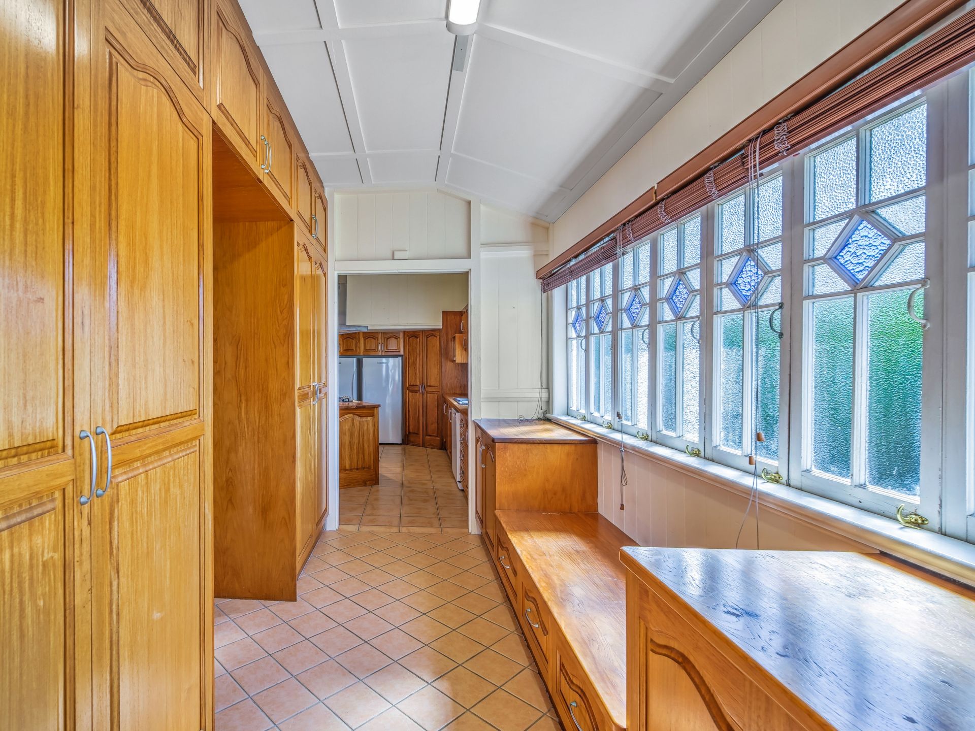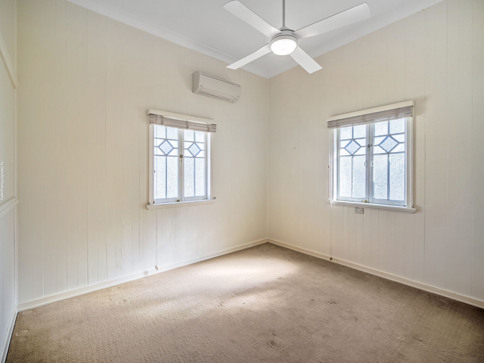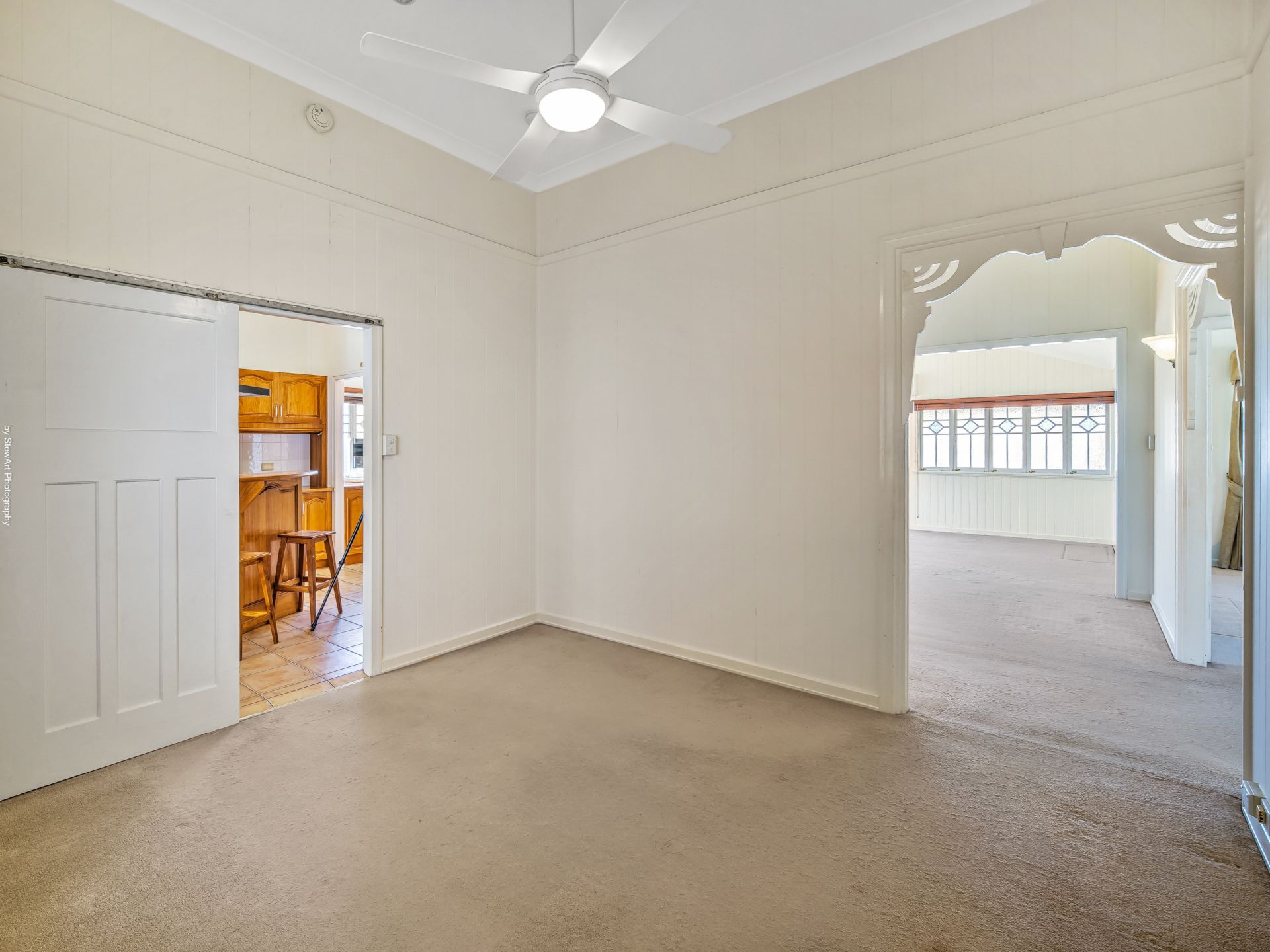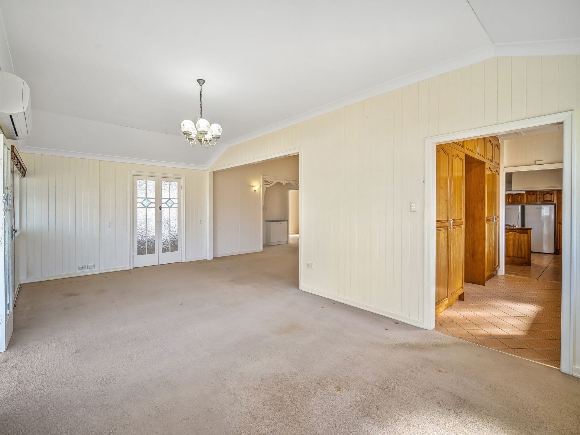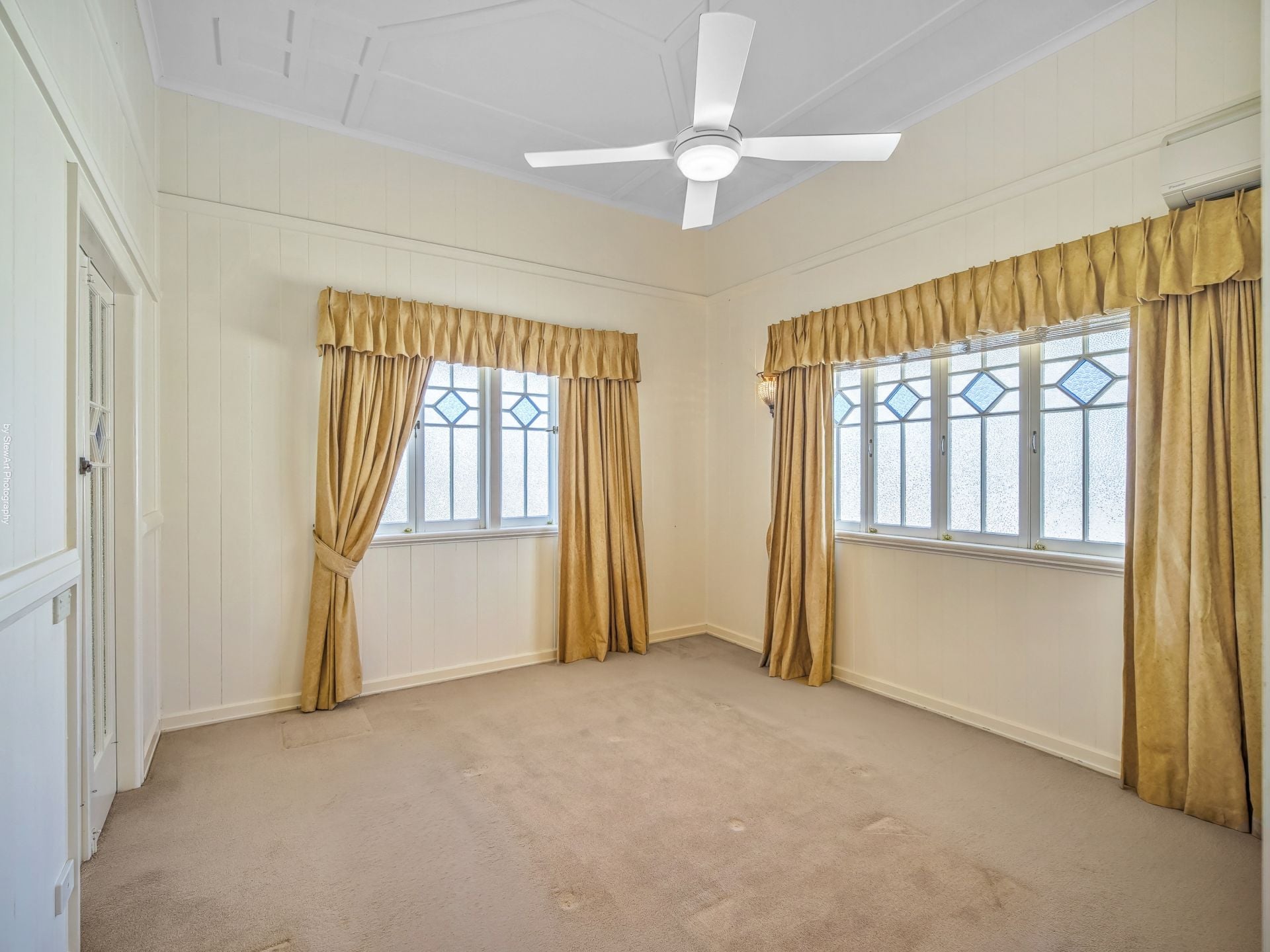• A vast open-plan dining and living area with beautiful decorative casement windows, ceiling fan and split system air-conditioning