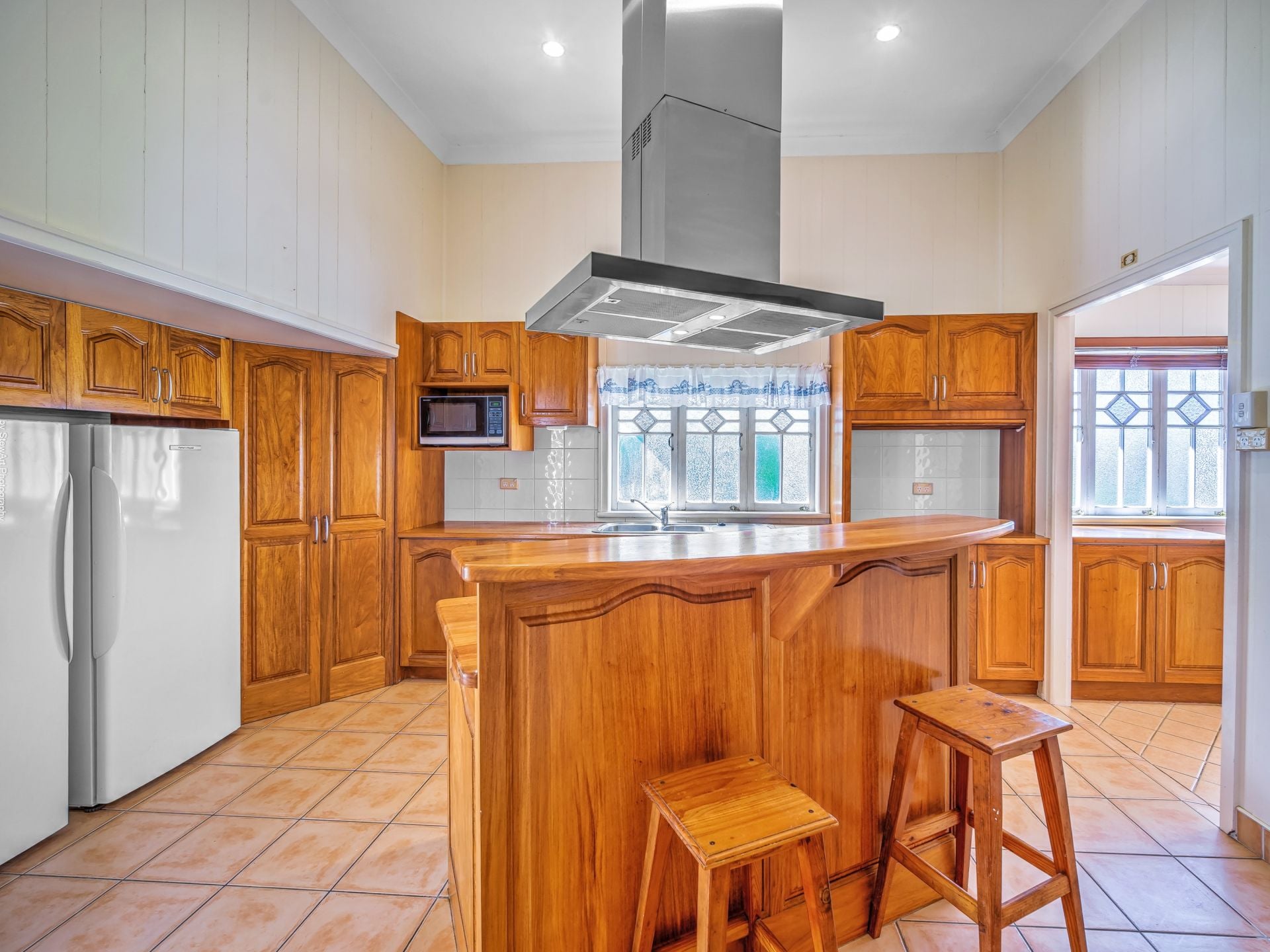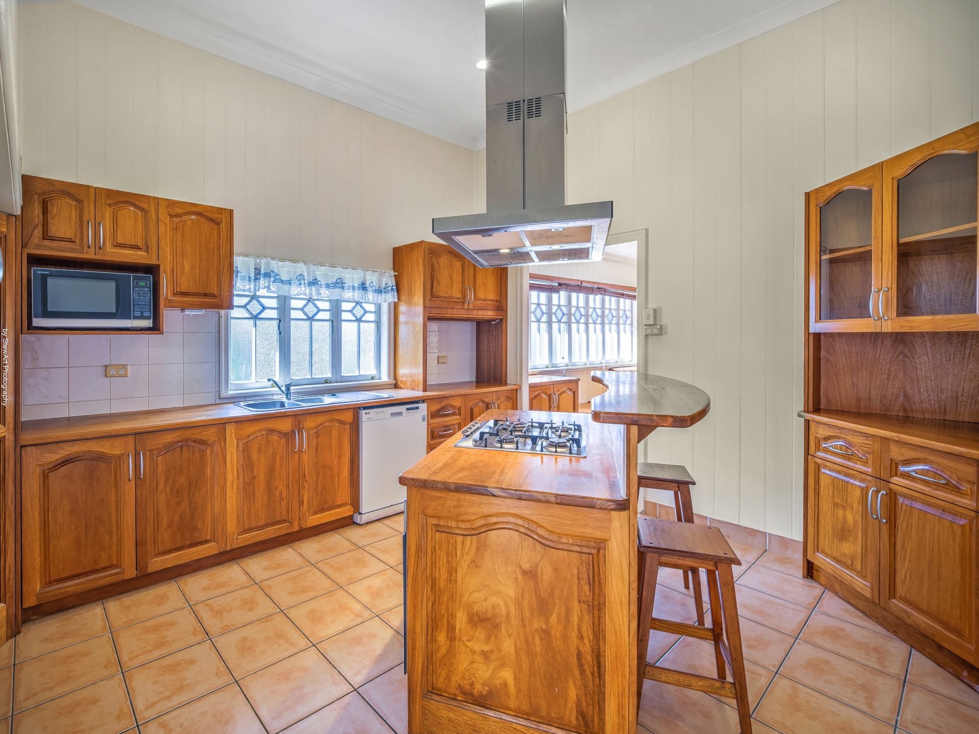 • A timeless timber kitchen with an island bench cooking station, breakfast bar and pantry
