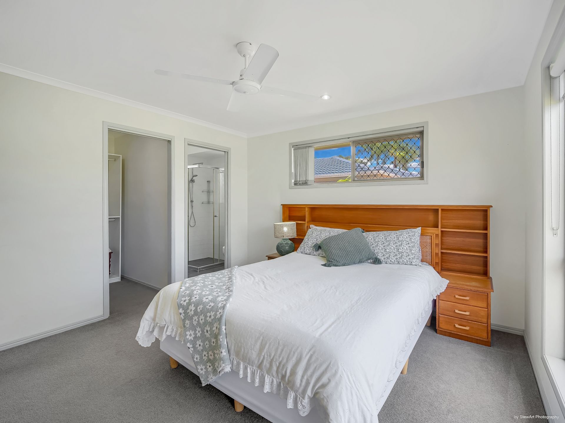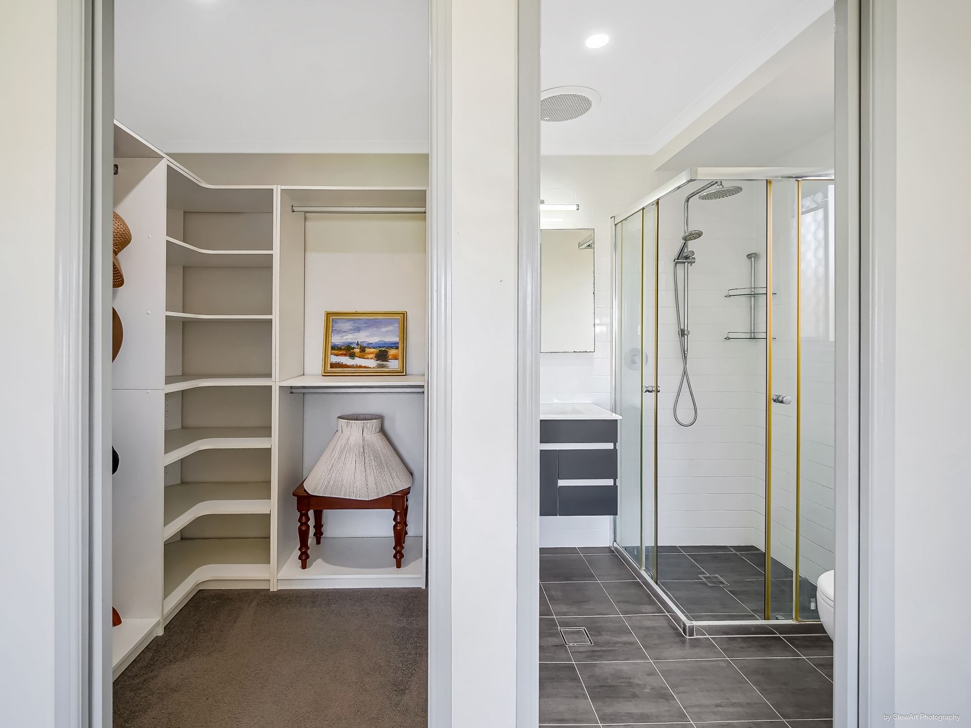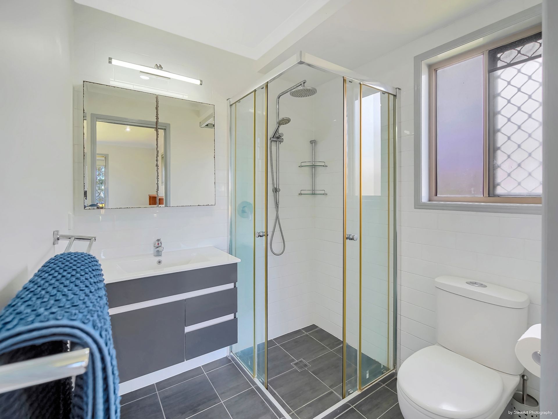 • The spacious main bedroom includes a ceiling fan, a walk-in wardrobe with built-in cabinetry, and a refurbished ensuite with shower, vanity, and toilet