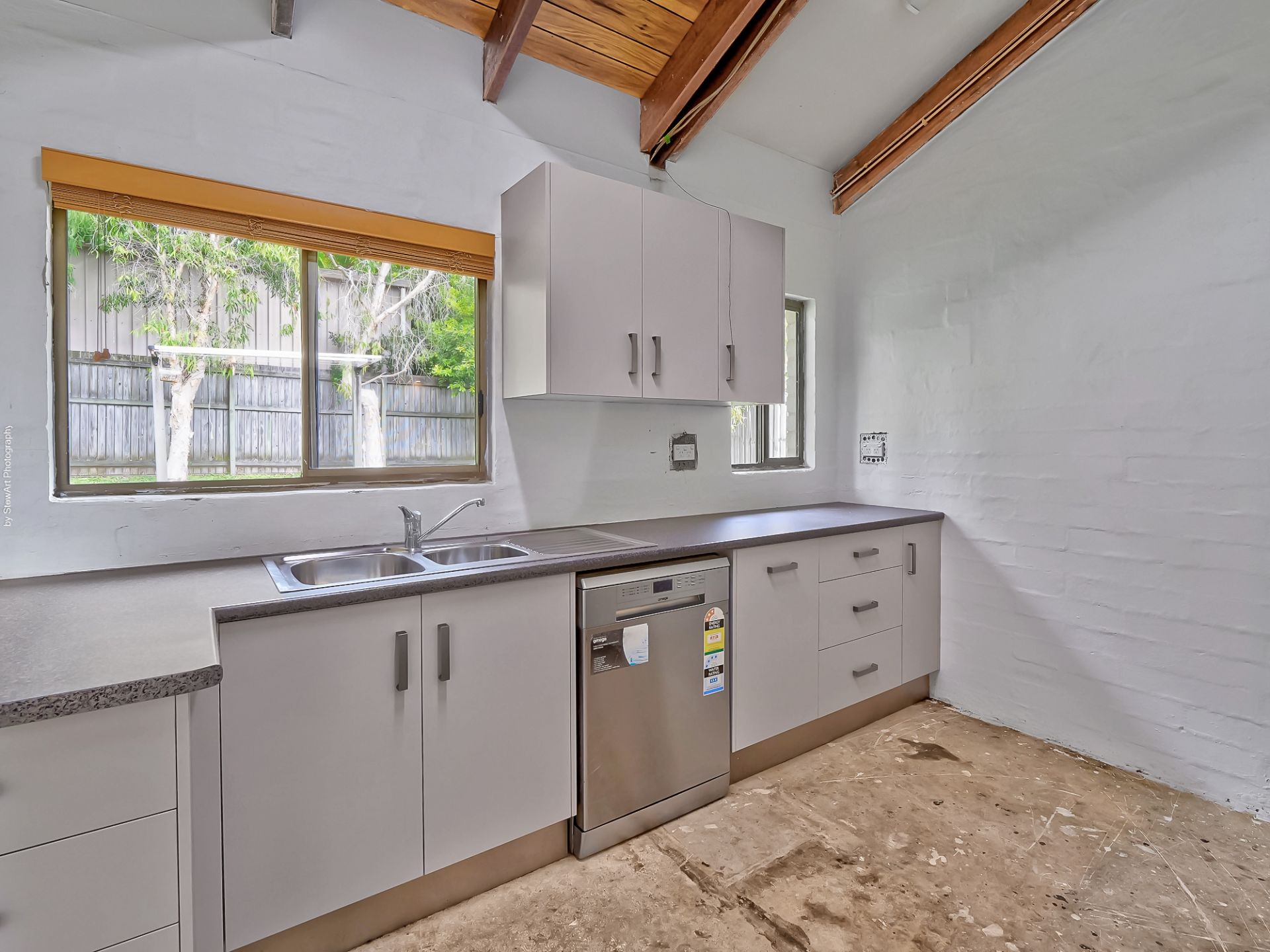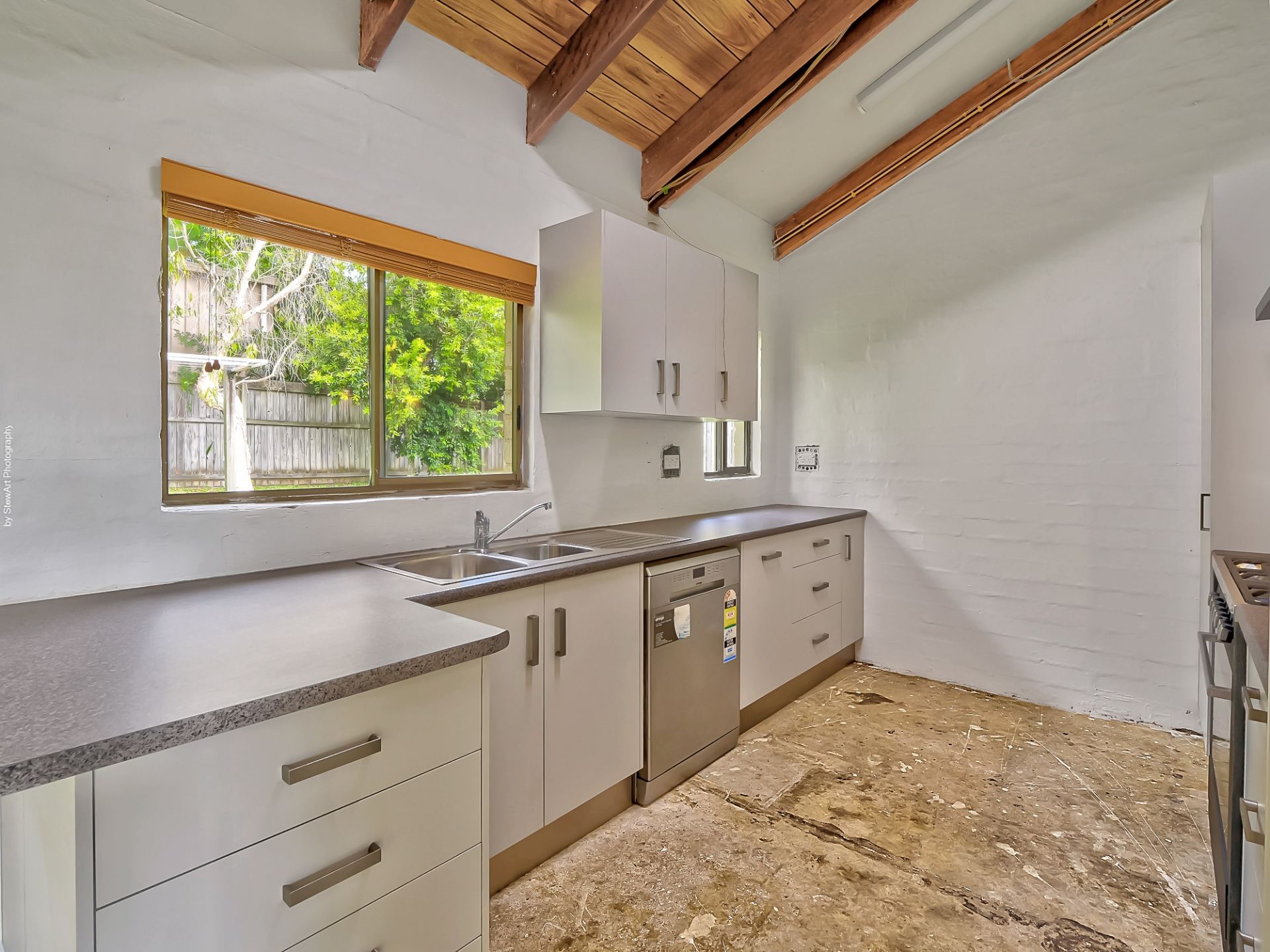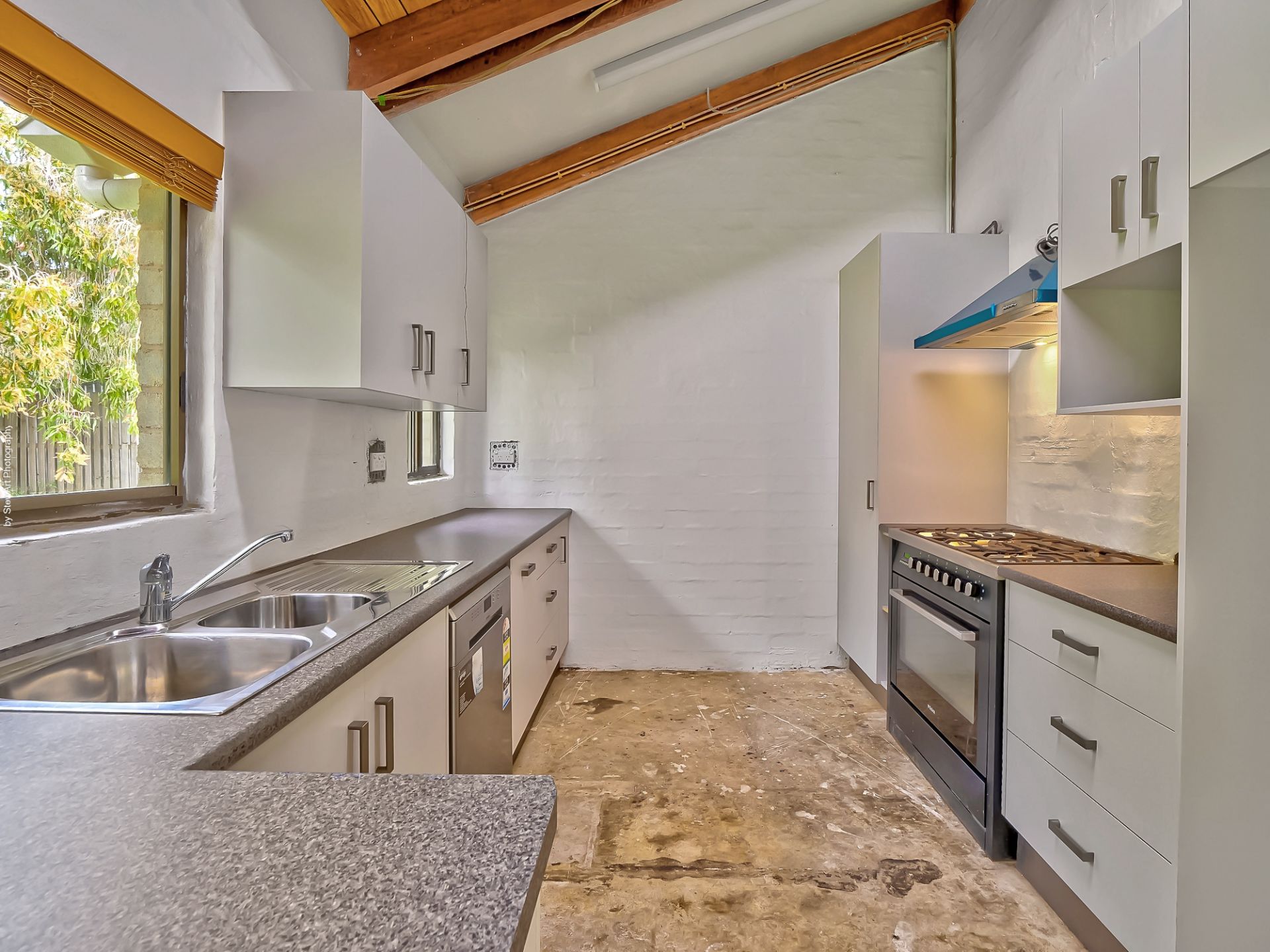 • Appliances include a freestanding 900mm electric oven with a gas cooktop and rangehood, plus a dishwasher