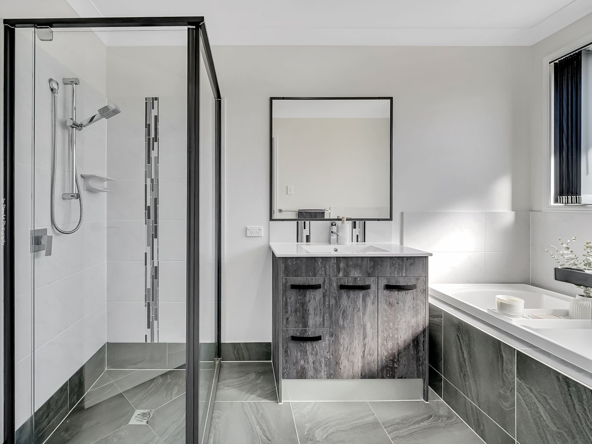 • The bathroom includes a vanity, a bath and shower, plus a separate toilet