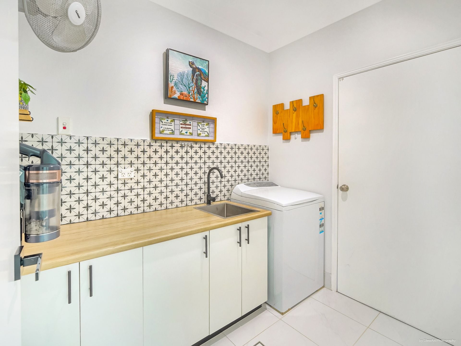 • The laundry includes ample bench and linen storage and offers direct access outside to the clothesline