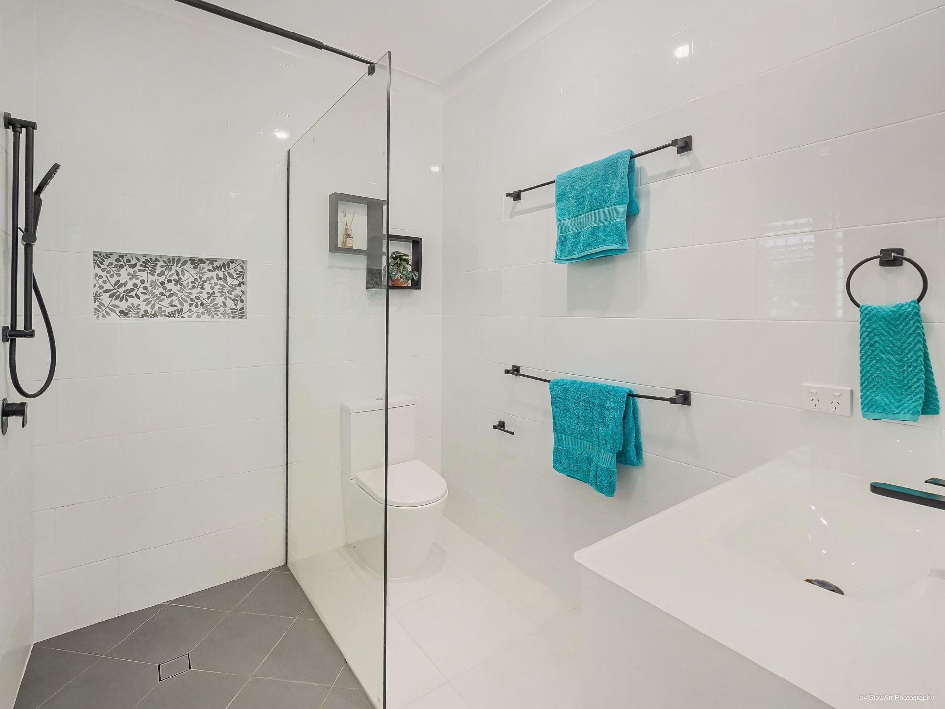 • The main bedroom includes a walk-in wardrobe and a lavish ensuite with floor-to-ceiling tiles, a shower, a vanity, and a toilet