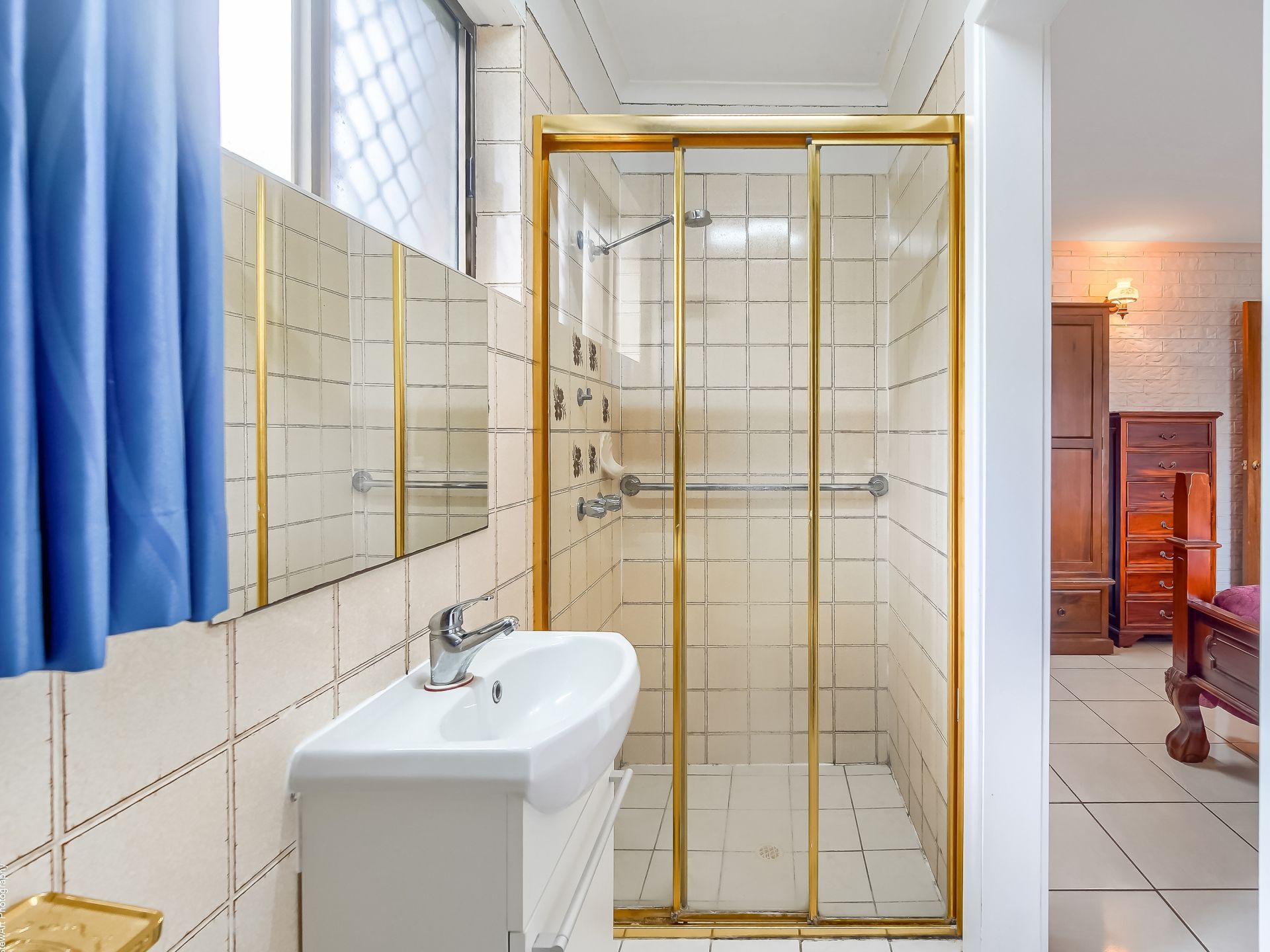• The main bathroom includes a bath, a shower, and a vanity, plus a separate toilet