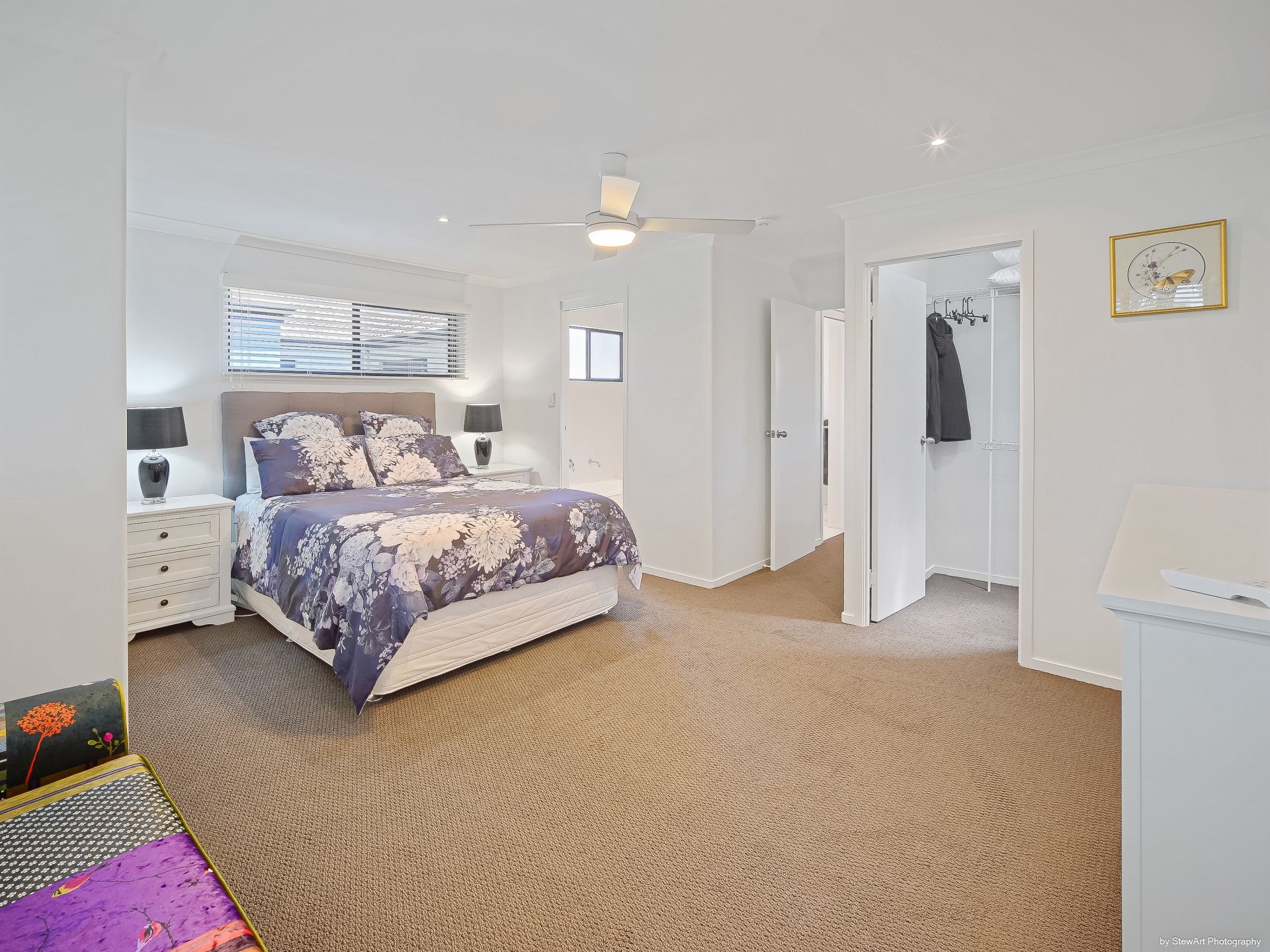 • The main bedroom on the ground floor features a ceiling fan, reverse cycle split system air-conditioning, a walk-in wardrobe, and an ensuite