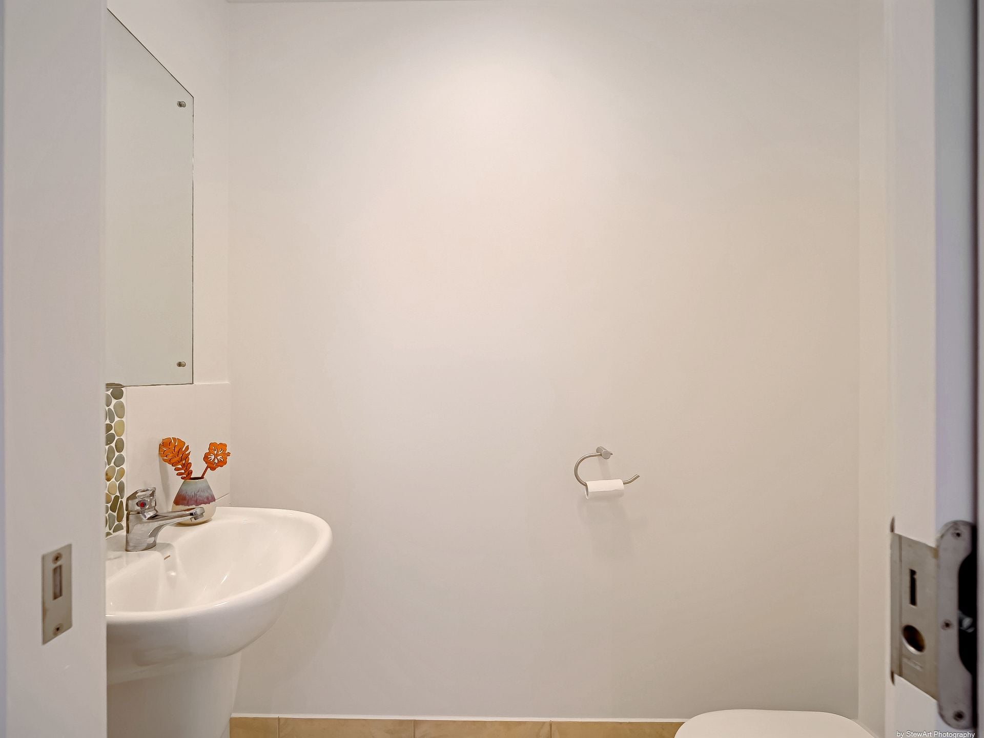 • The two-way bathroom upstairs features floor-to-ceiling tiles, a shower, a vanity and a toilet